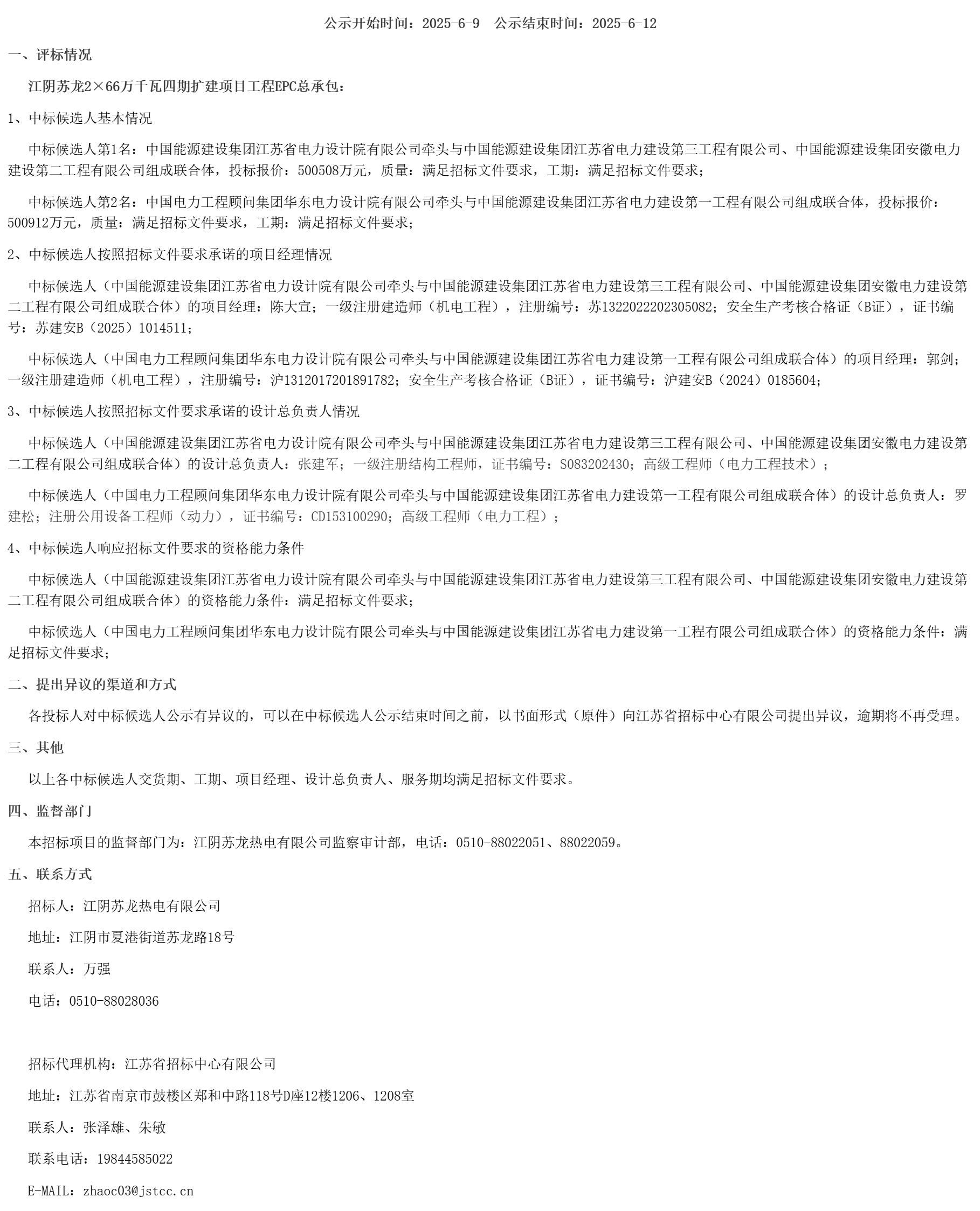 中标候选人(中国电力工程顾问集团华东电力设计院有限公司牵头与中国能源建设集团江苏省电力建设第一工程有限公司组成联合体)的设计总负责人:罗建松;注册公用设备工程师(动力),证书编号:***********;高级工程师(电力工程);