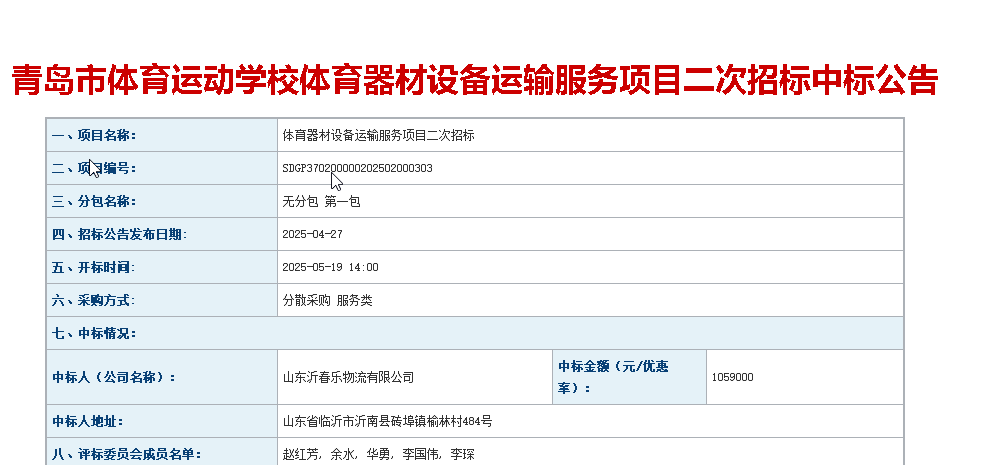 青岛市体育运动学校体育器材设备运输服务项目二次招标中标公告