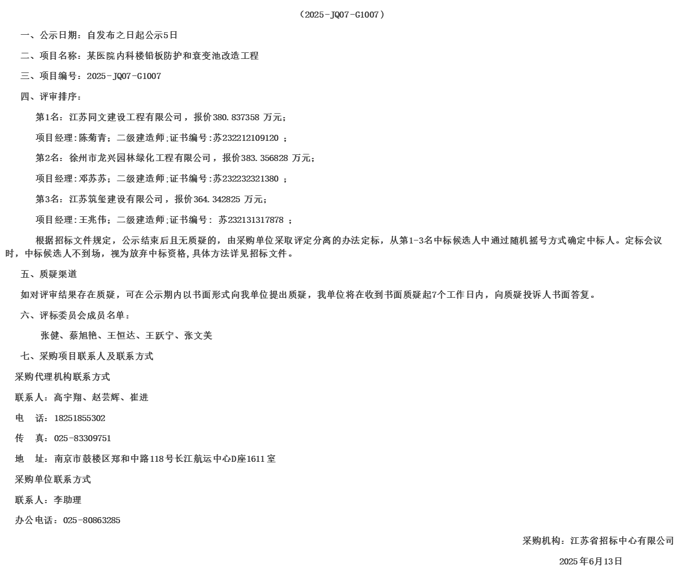 某医院内科楼铅板防护和衰变池改造工程-中标候选人公示