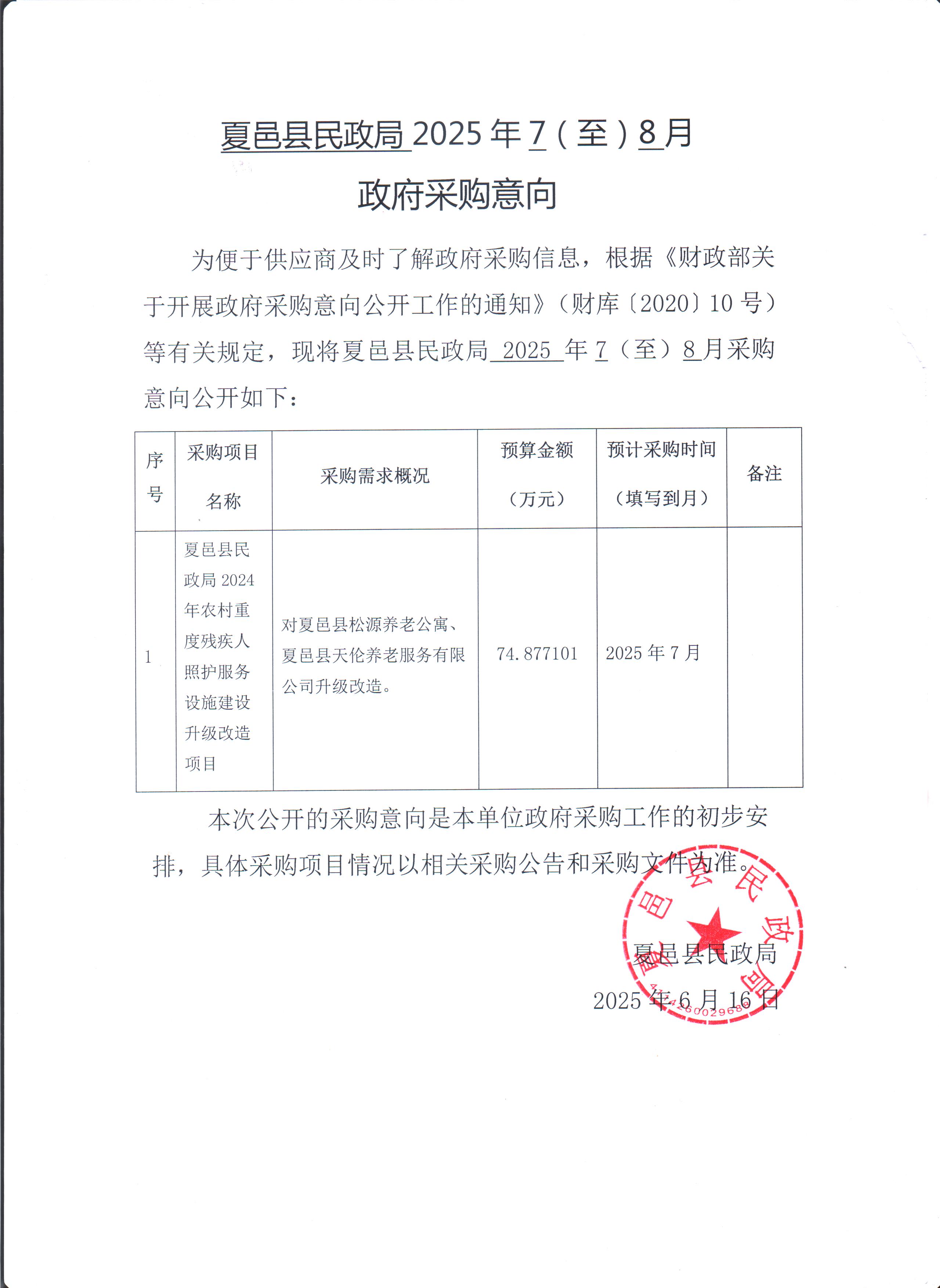 河南省夏邑县民政局2025年7至8月政府采购意向