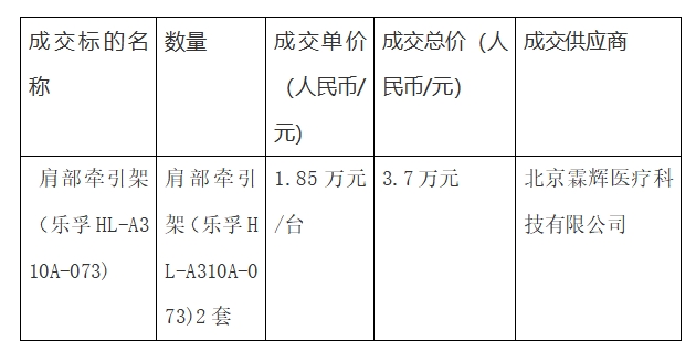 通过设备科论证骨外四科需购买肩部牵引架项目,于****年*月**日在医院官网发布湛中心医器械采【****】**号采购信息,有四家公司(广东盈加贸易有限公司、北京霖辉医疗科技有限公司、广东华华阳光科技有限公司、湛江湛科医疗器械有限公司)报名响应。根据采购流程****年*月**日组织相关人员开会洽谈竞价,与会人员一致认为,北京霖辉医疗科技有限公司提供的肩部牵引架(乐孚************) 型号规格、技术参数符合使用科室要求,现将洽谈采购结果公示如下:
