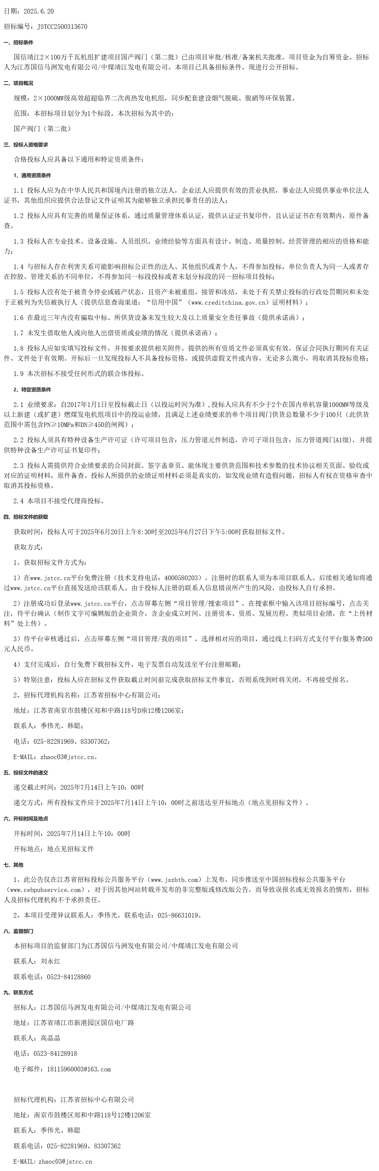 国信靖江*×***万千瓦机组扩建项目国产阀门(第二批)招标公告(***************)