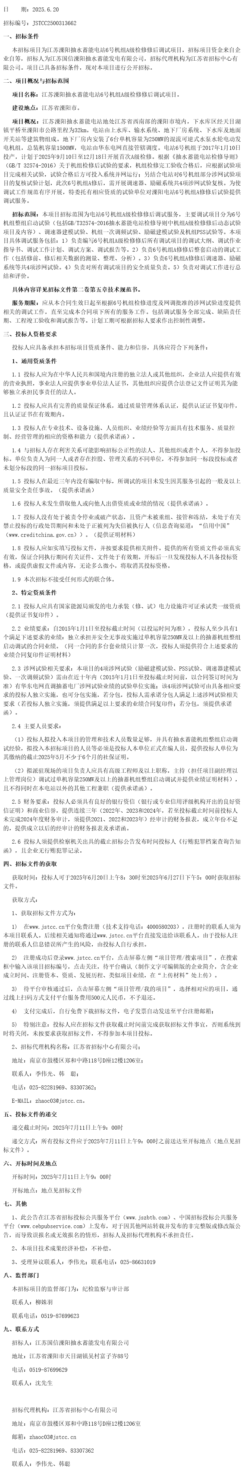 江苏溧阳抽水蓄能电站*号机组*级检修修后调试项目招标公告(***************)