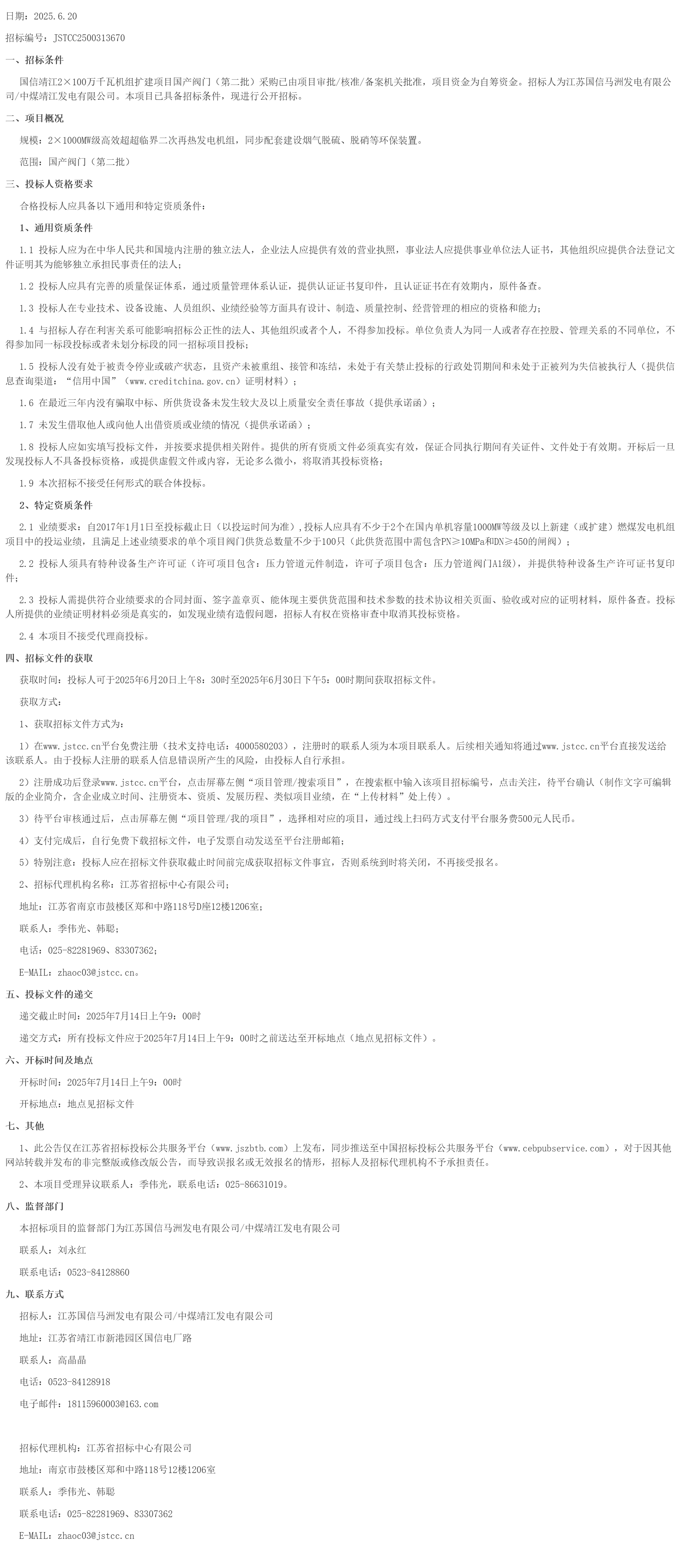 国信靖江*×***万千瓦机组扩建项目国产阀门(第二批)采购招标公告(***************)