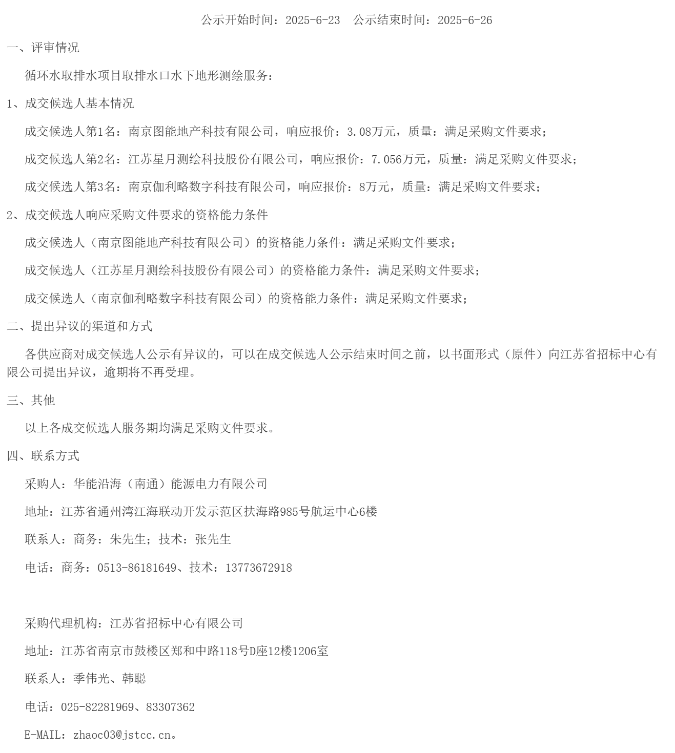 华能南通(通州湾)2×100万千瓦大型清洁高效煤电项目循环水取排水项目取排水口水下地形测绘服务成交候选人公示(JSTCC2500313306)