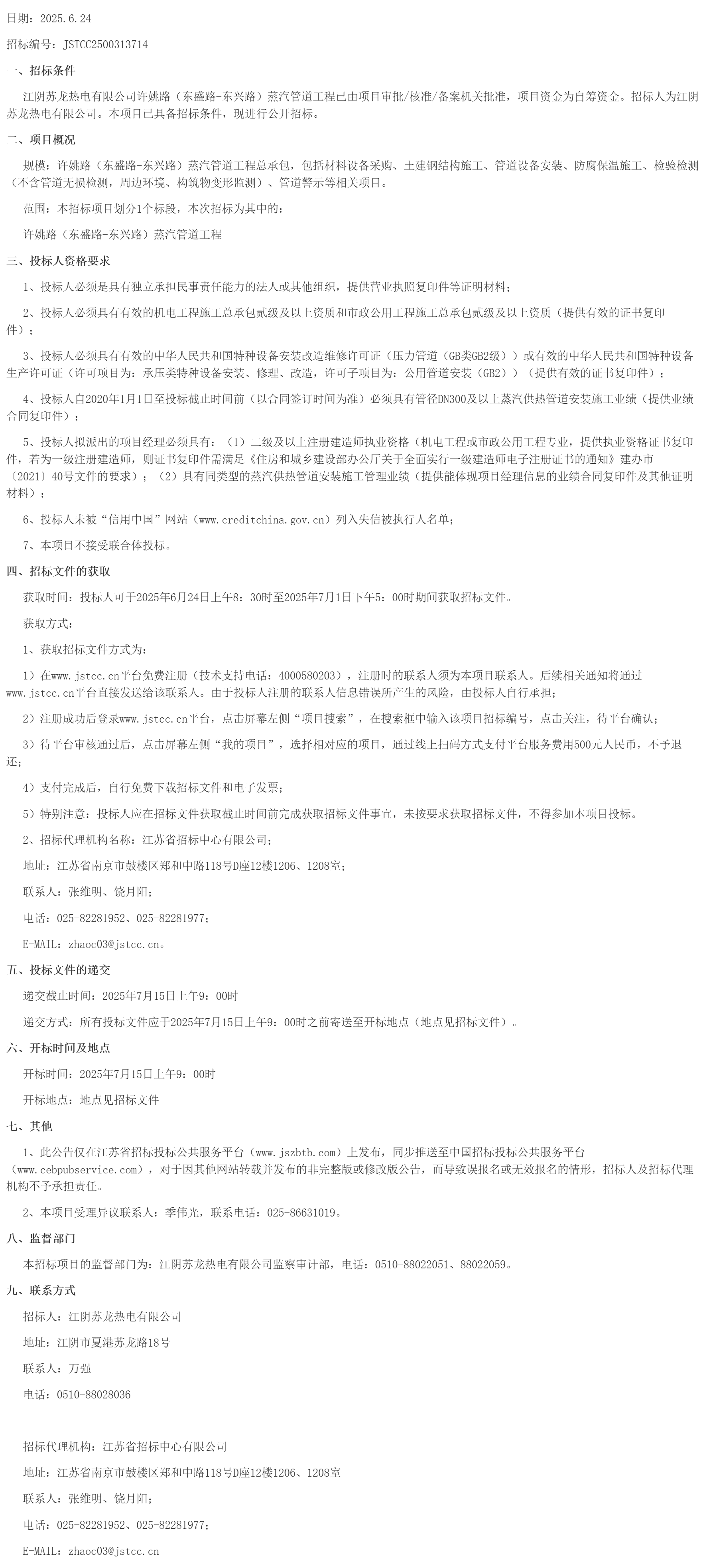 江阴苏龙热电有限公司许姚路(东盛路*东兴路)蒸汽管道工程招标公告(***************)