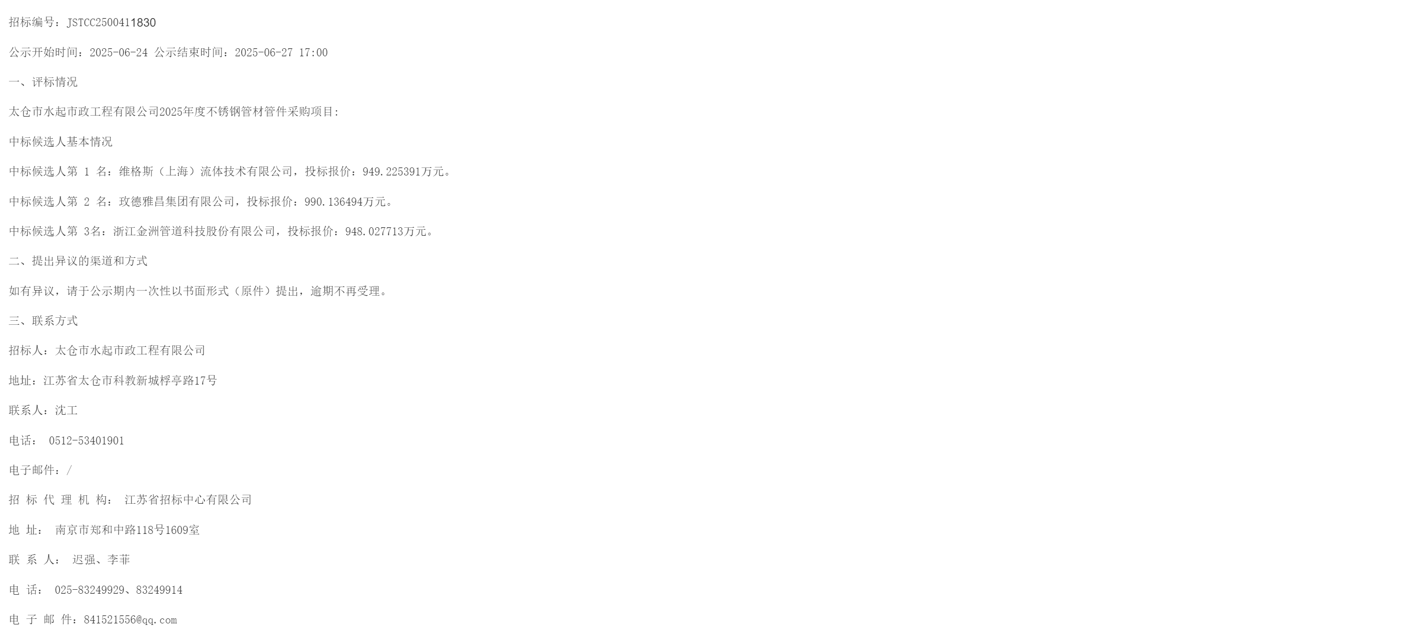 太仓市水起市政工程有限公司2025年度不锈钢管材管件采购项目-中标候选人公示