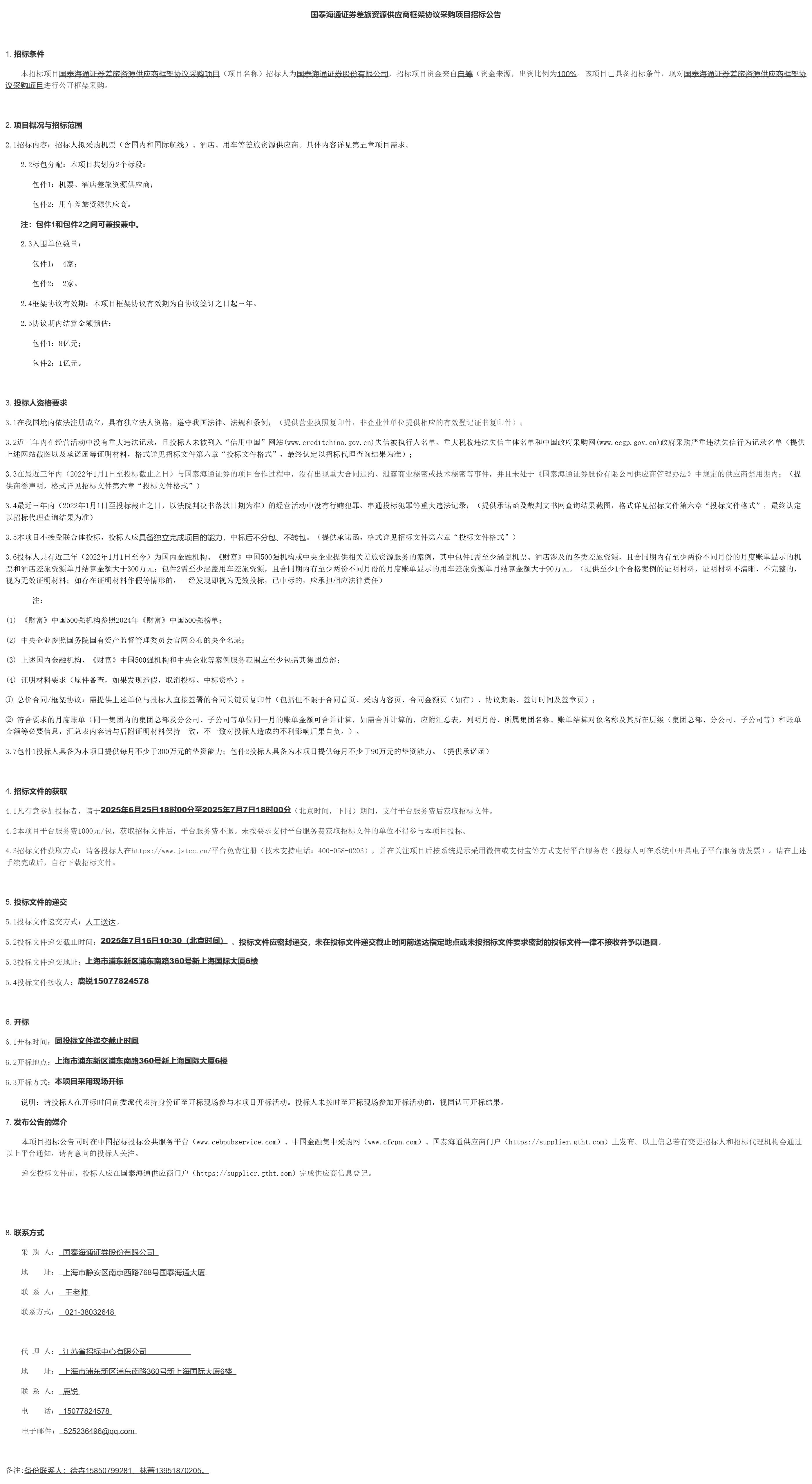 国泰海通证券差旅资源供应商框架协议采购项目招标公告