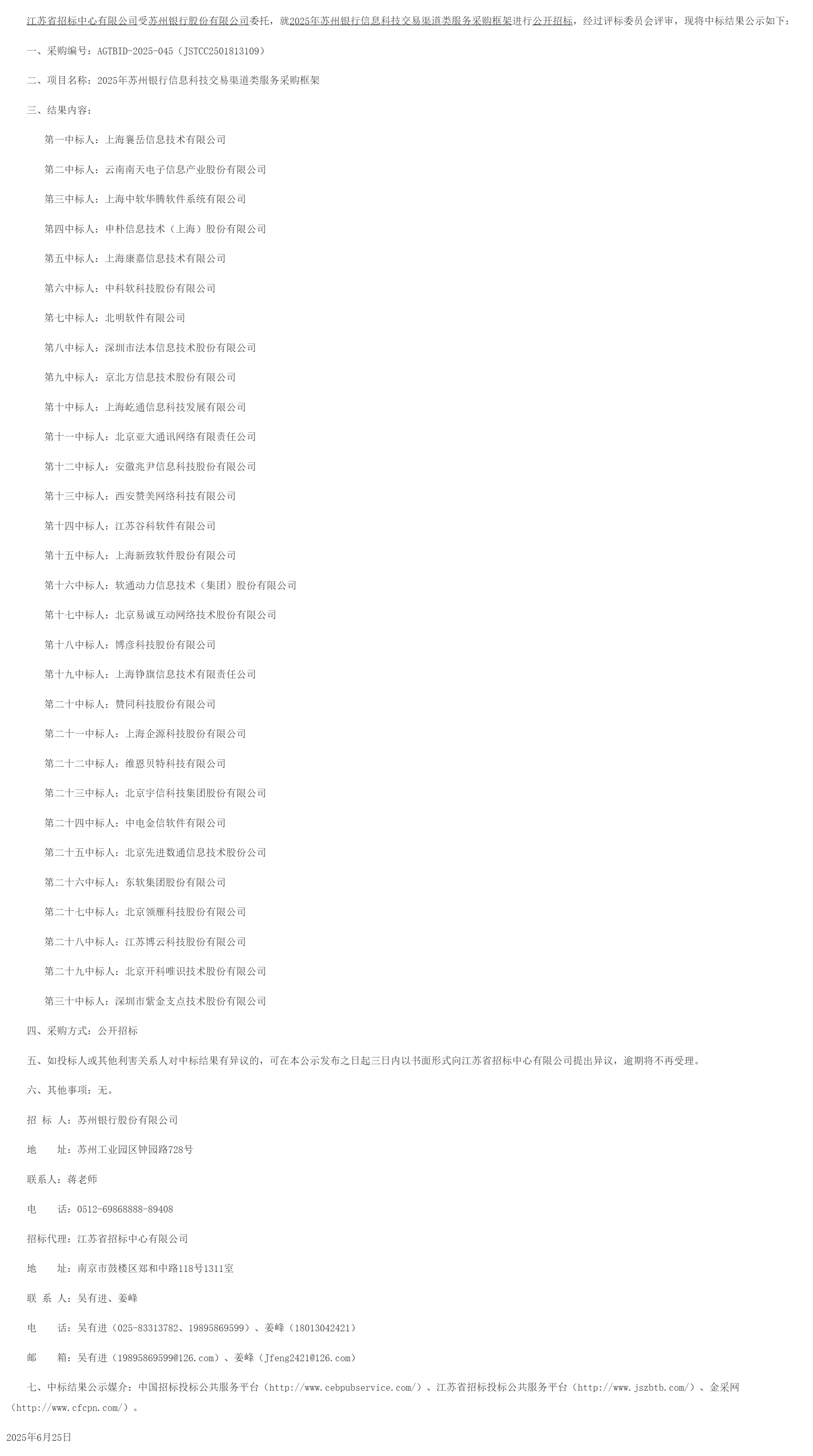 ****年苏州银行信息科技交易渠道类服务采购框架中标结果公示