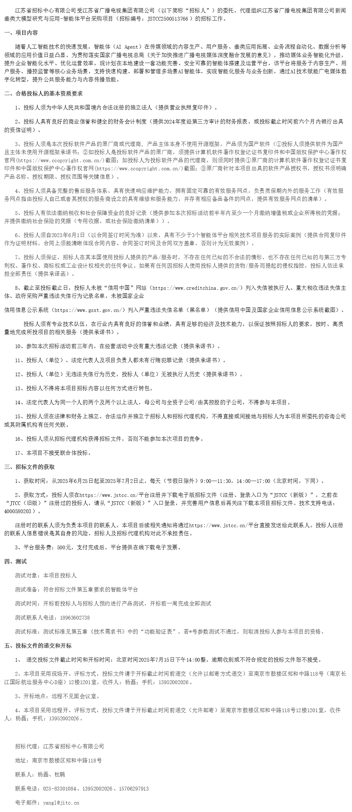 江苏省广播电视集团有限公司新闻垂类大模型研究与应用*智能体平台采购项目招标公告