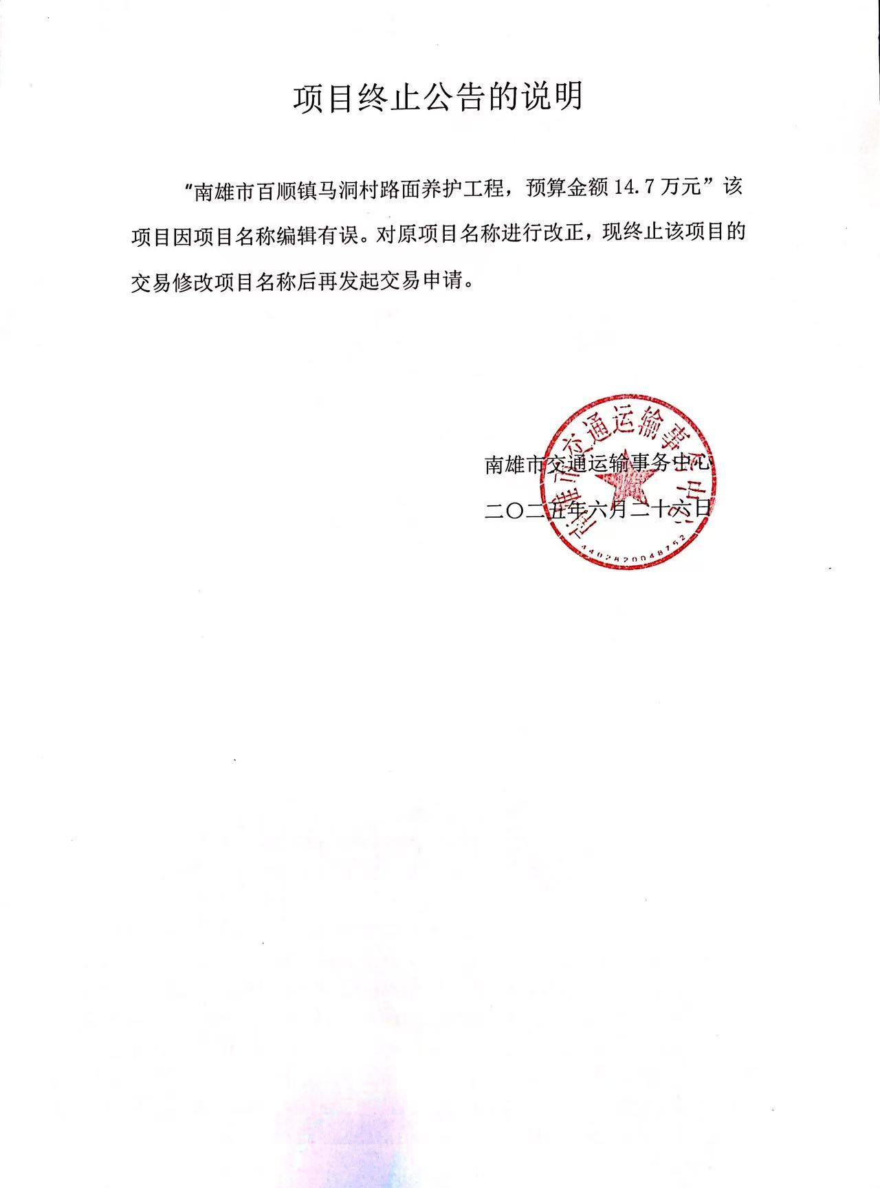 南雄市百顺镇马洞村路面养护工程,预算金额14.7万元终止公告