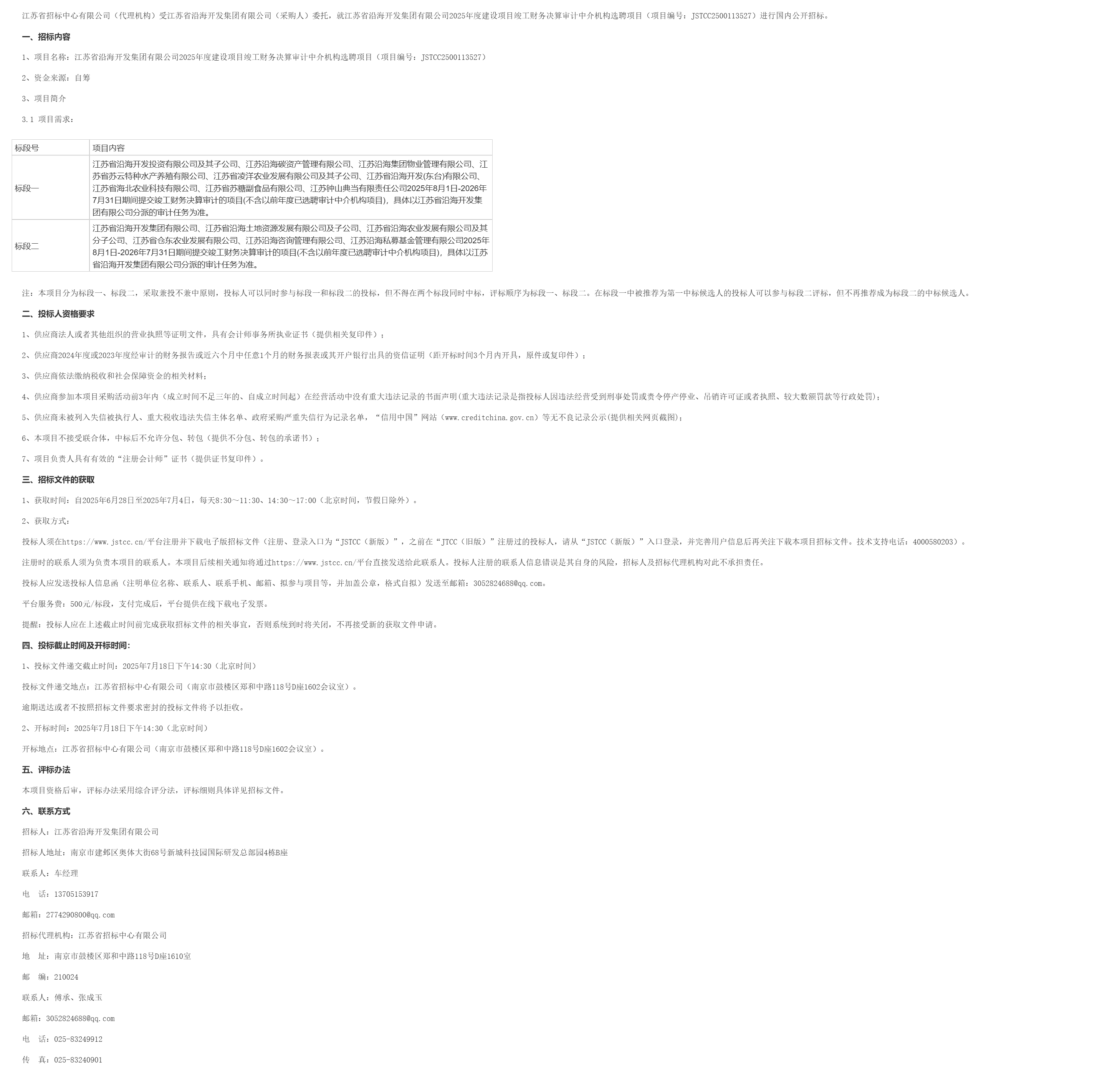 | 标段二 | 江苏省沿海开发集团有限公司、江苏省沿海土地资源发展有限公司及子公司、江苏省沿海农业发展有限公司及其分子公司、江苏省仓东农业发展有限公司、江苏沿海咨询管理有限公司、江苏沿海私募基金管理有限公司****年*月*日*****年*月**日期间提交竣工财务决算审计的项目(不含以前年度已选聘审计中介机构项目),具体以江苏省沿海开发集团有限公司分派的审计任务为准。 |