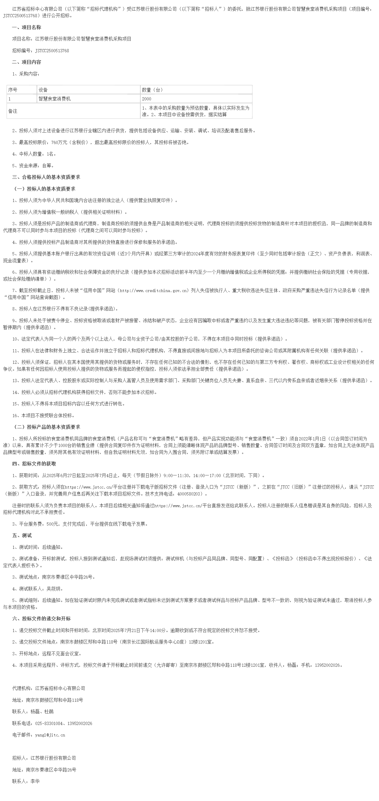 江苏省招标中心有限公司(以下简称“招标代理机构”)受江苏银行股份有限公司(以下简称“招标人”)的委托,就江苏银行股份有限公司智慧食堂消费机采购项目(项目编号:***************)进行公开招标。