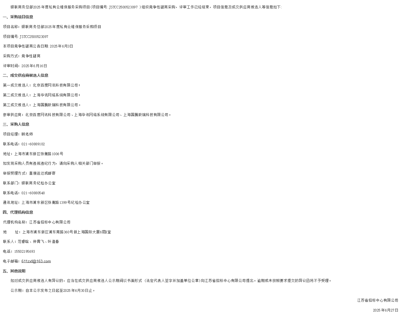 银联商务总部2025年度私有云维保服务采购项目成交供应商候选人公示