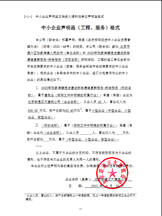 | 北京联通正大建筑公司 | * | ****.***万元 | ****.***万元 | 北京市通州区张家湾镇集体土地和国有土地上的违法建设拆除工作。估算面积**.*万平方米。项目范围内违法建设的强制拆除工作(包括但不限于拆除、安保工作、物品清登、现有物品搬运清理、垃圾清运、渣土消纳、围挡搭建、裸露地面苫盖、现场管控、覆土平整、硬化地面抠除、仓储服务(含运输)、验收销账等强制拆除相关工作) |