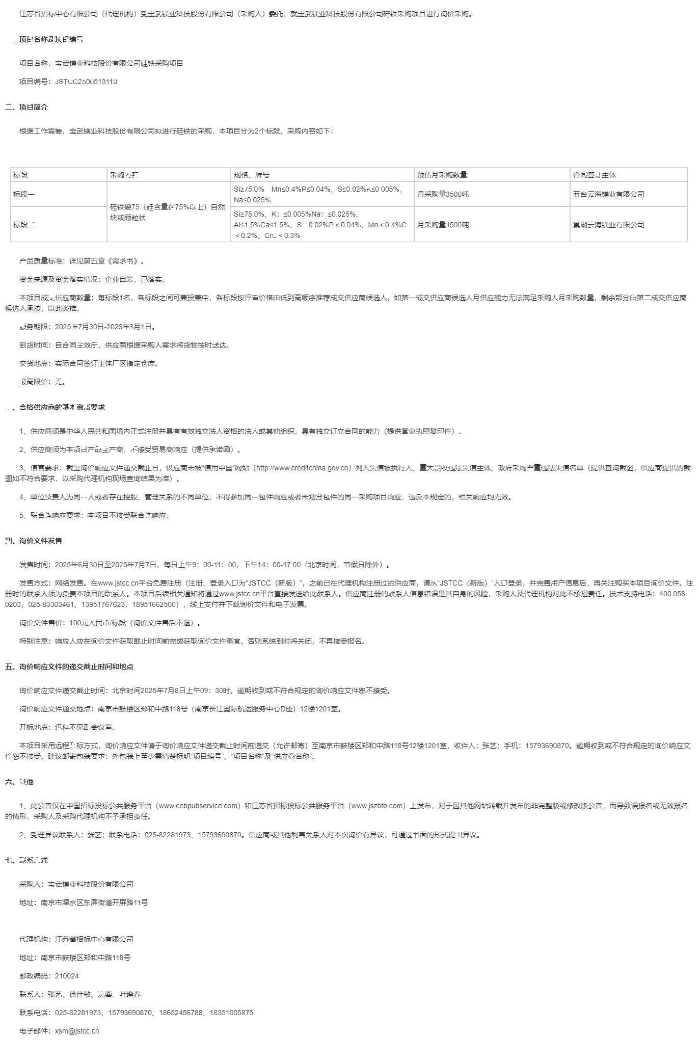 江苏省招标中心有限公司(代理机构)受宝武镁业科技股份有限公司(采购人)委托,就宝武镁业科技股份有限公司硅铁采购项目进行询价采购。