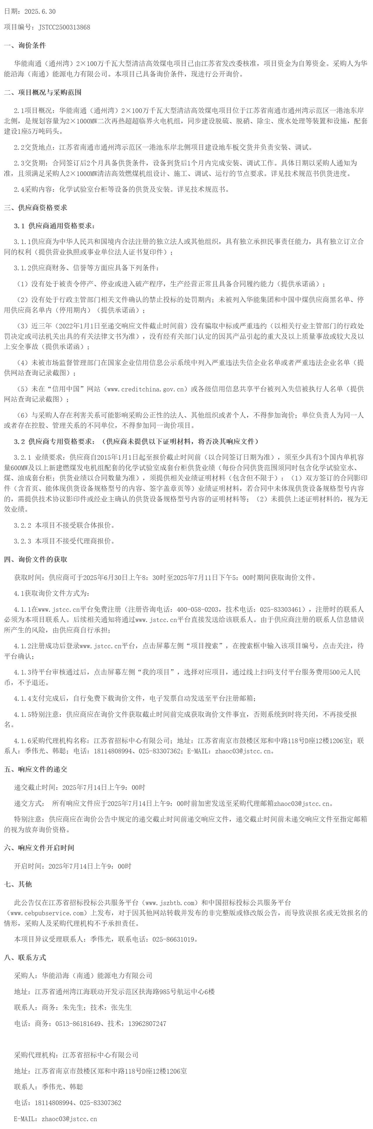 华能南通(通州湾)*×***万千瓦大型清洁高效煤电项目已由江苏省发改委核准,项目资金为自筹资金。采购人为华能沿海(南通)能源电力有限公司。本项目已具备询价条件,现进行公开询价。