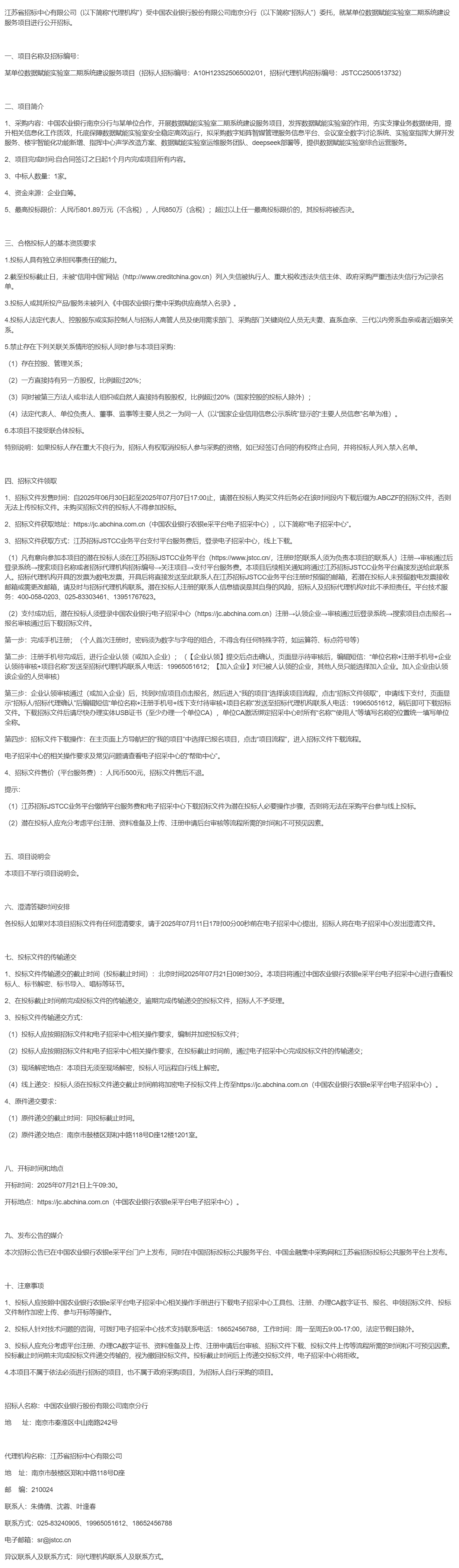 江苏省招标中心有限公司(以下简称“代理机构”)受中国农业银行股份有限公司南京分行(以下简称“招标人”)委托,就某单位数据赋能实验室二期系统建设服务项目进行公开招标。
