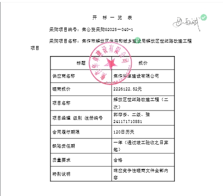 焦作市解放区住房和城乡建设局解放区世纪路改建工程项目(二次)—成交结果公告