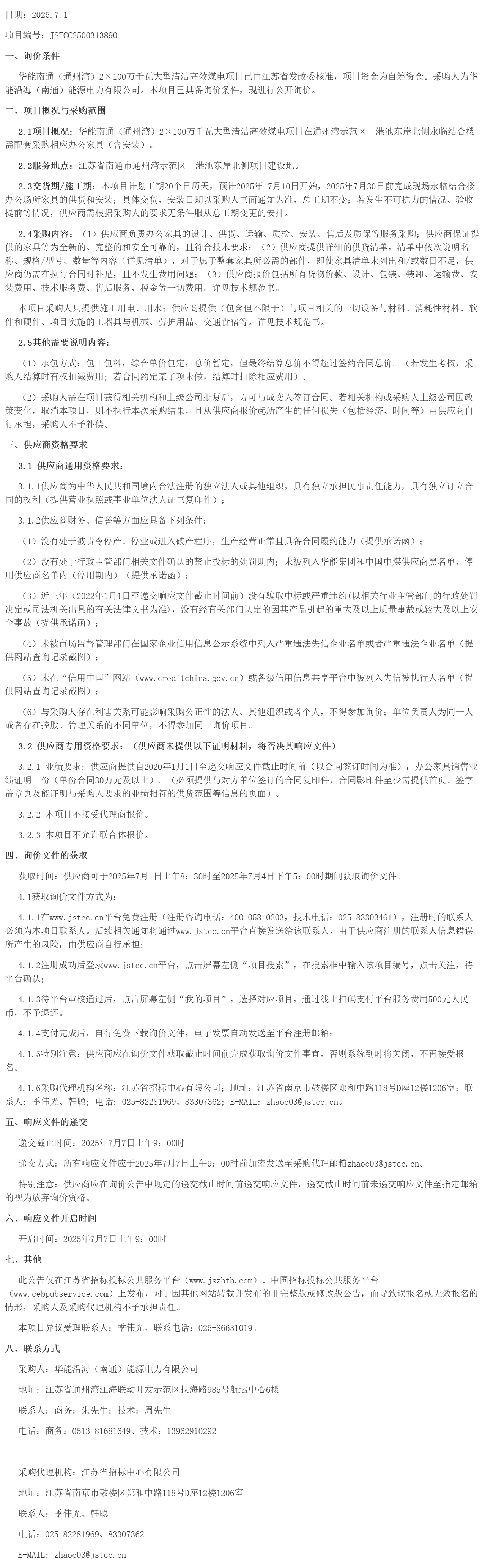 华能南通(通州湾)*×***万千瓦大型清洁高效煤电项目永临结合楼办公家具采购询价公告(***************)