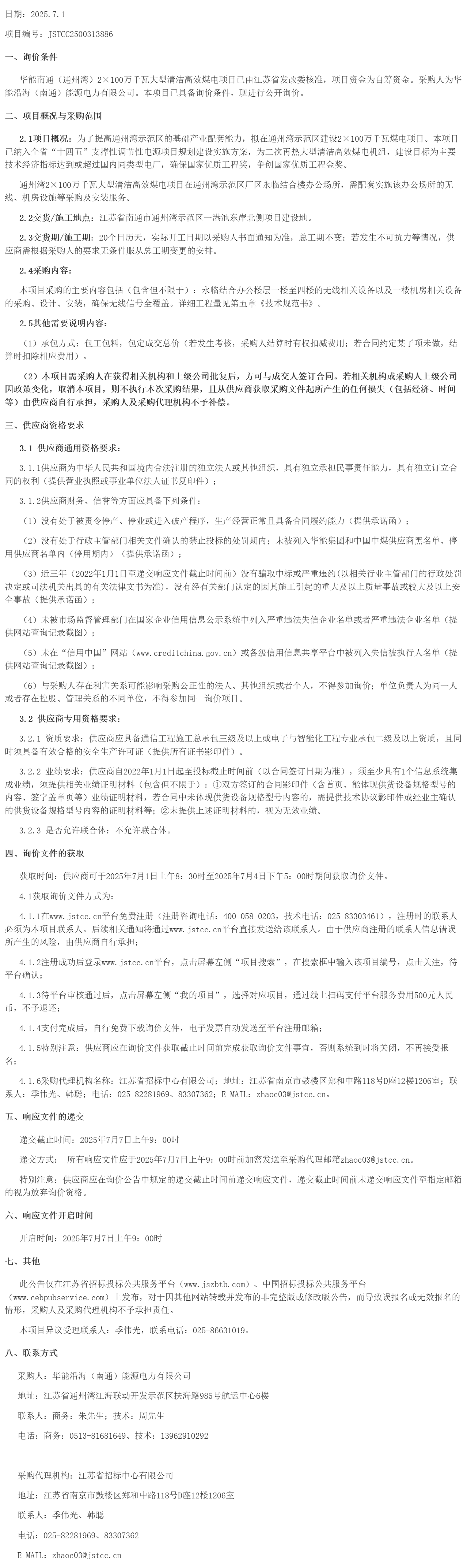 华能南通(通州湾)*×***万千瓦大型清洁高效煤电项目已由江苏省发改委核准,项目资金为自筹资金。采购人为华能沿海(南通)能源电力有限公司。本项目已具备询价条件,现进行公开询价。
