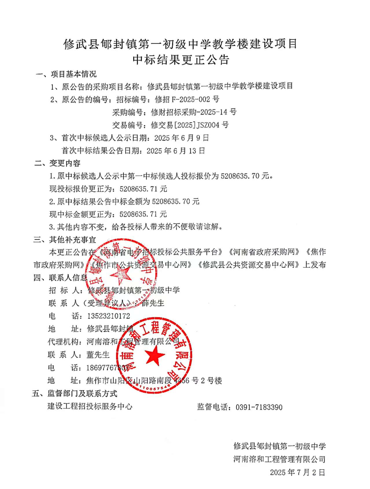修武县郇封镇第一初级中学教学楼建设项目*中标结果更正公告