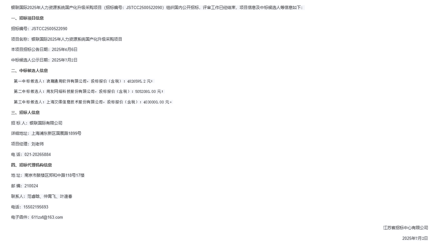 银联国际2025年人力资源系统国产化升级采购项目中标候选人公示