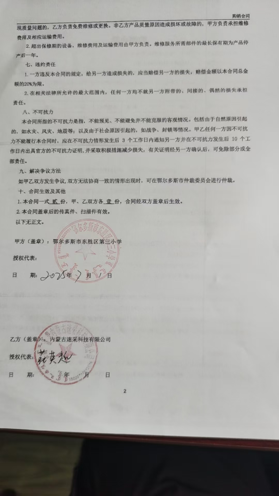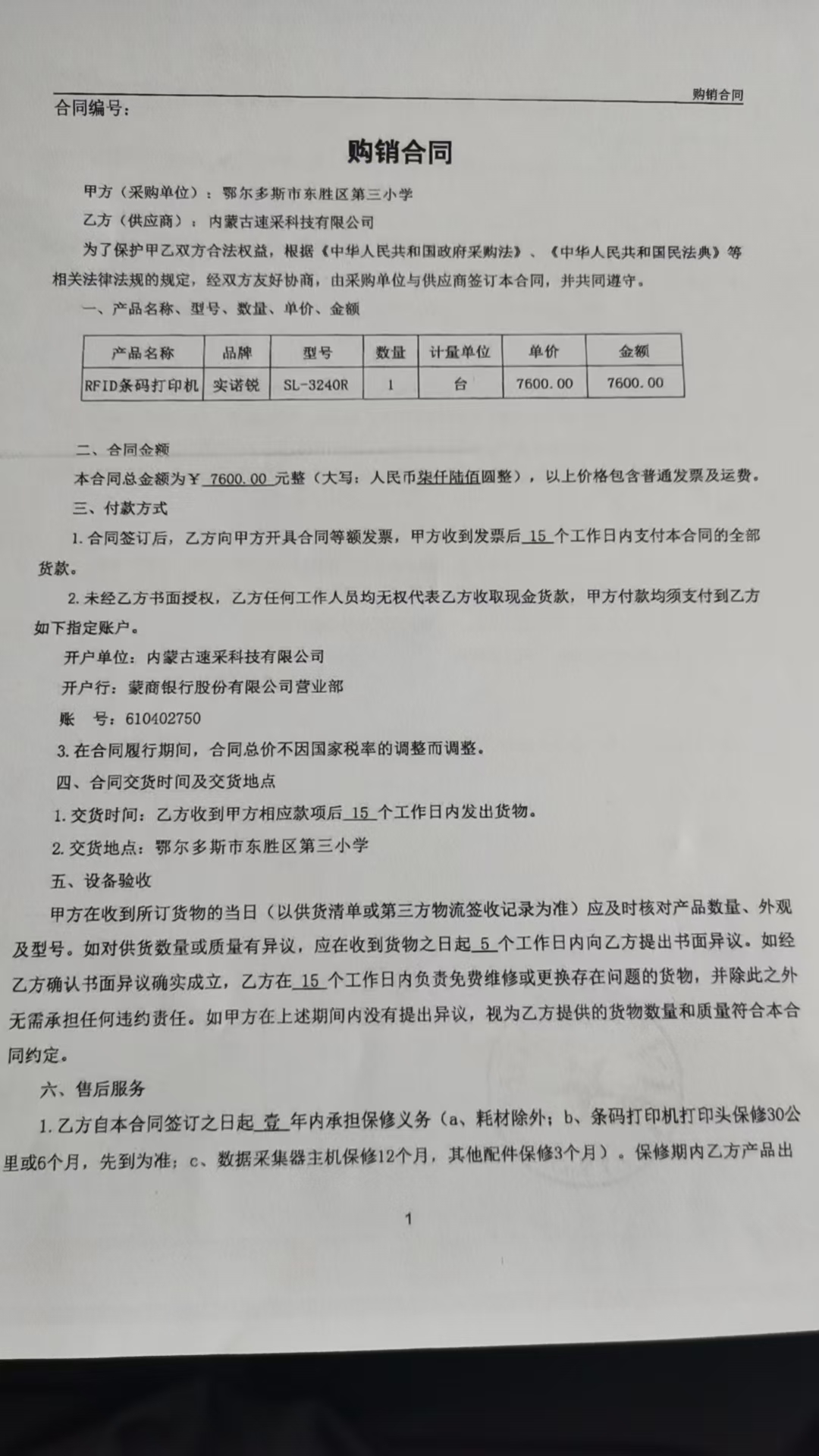 鄂尔多斯市东胜区第三小学第三小学条码打印机购销合同政府采购合同公告