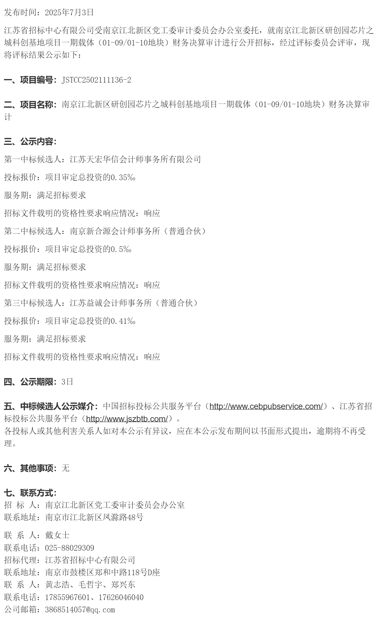南京江北新区研创园芯片之城科创基地项目一期载体(*****/*****地块)*财务决算审计*中标候选人公示