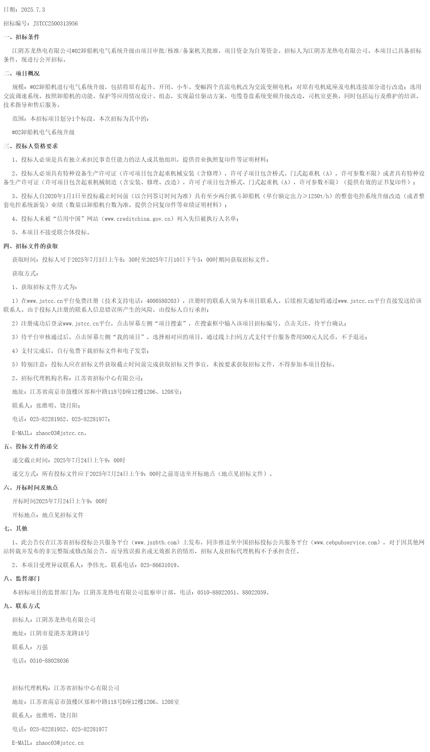 江阴苏龙热电有限公司#**卸船机电气系统升级招标公告(***************)