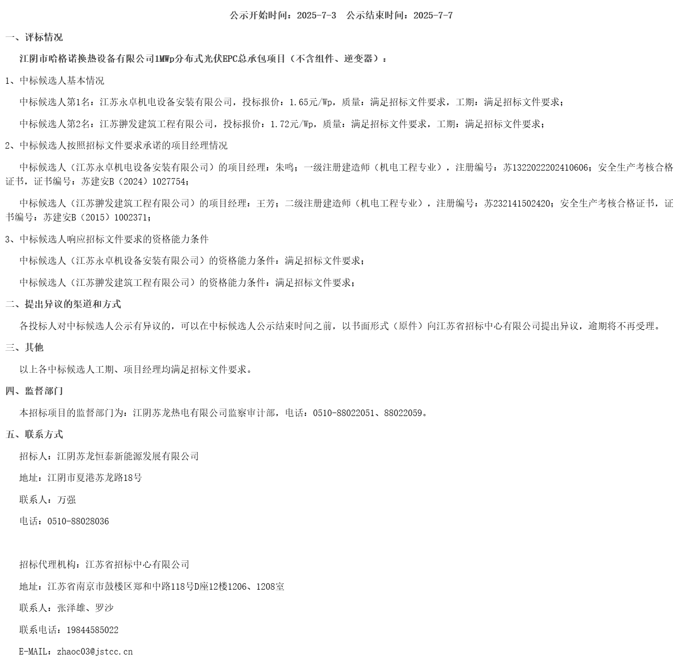 江阴苏龙恒泰新能源发展有限公司江阴市哈格诺换热设备有限公司****分布式光伏***总承包项目(不含组件、逆变器)中标候选人公示(***************)