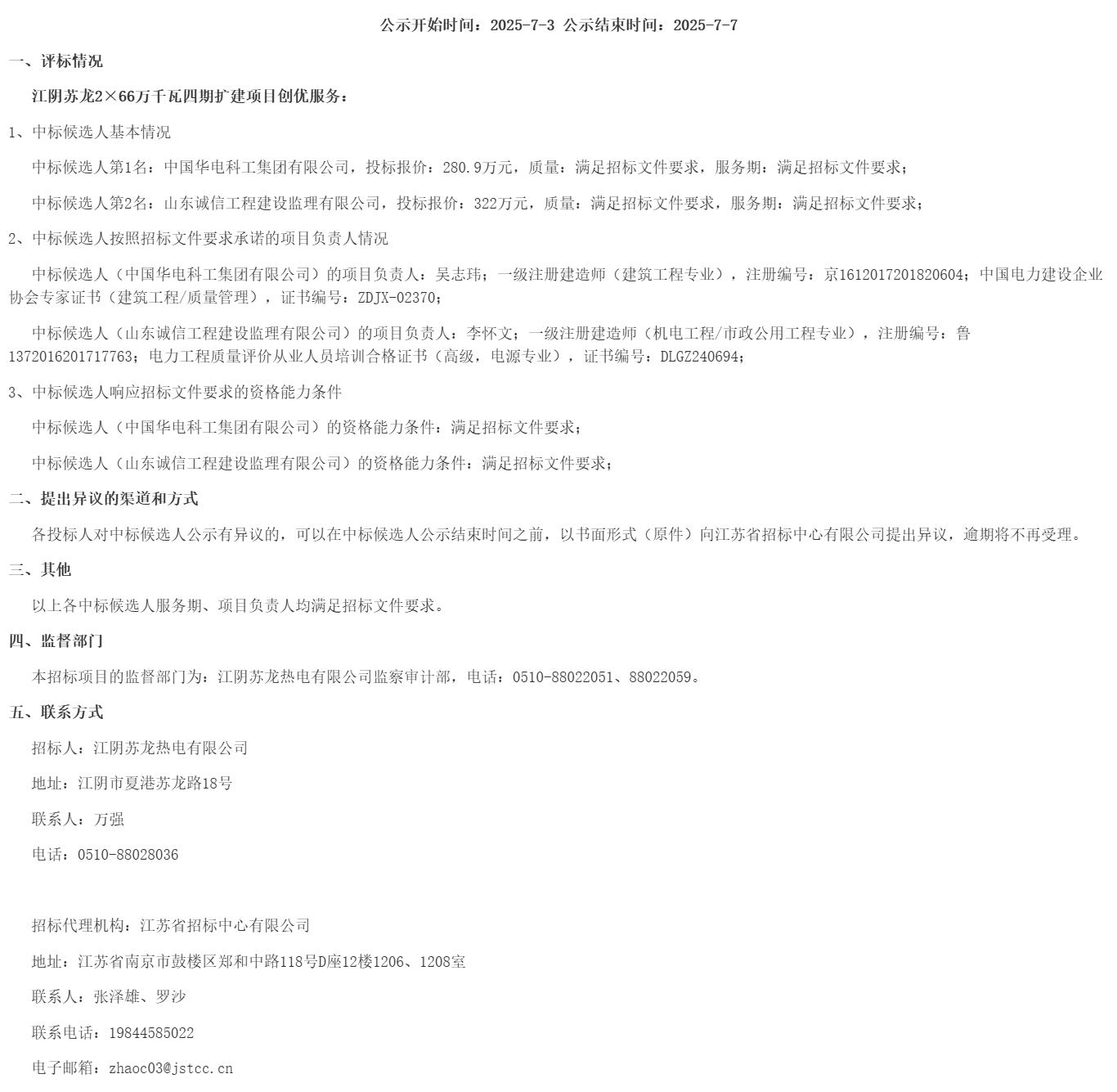 江阴苏龙*×**万千瓦四期扩建项目创优服务中标候选人公示(***************)