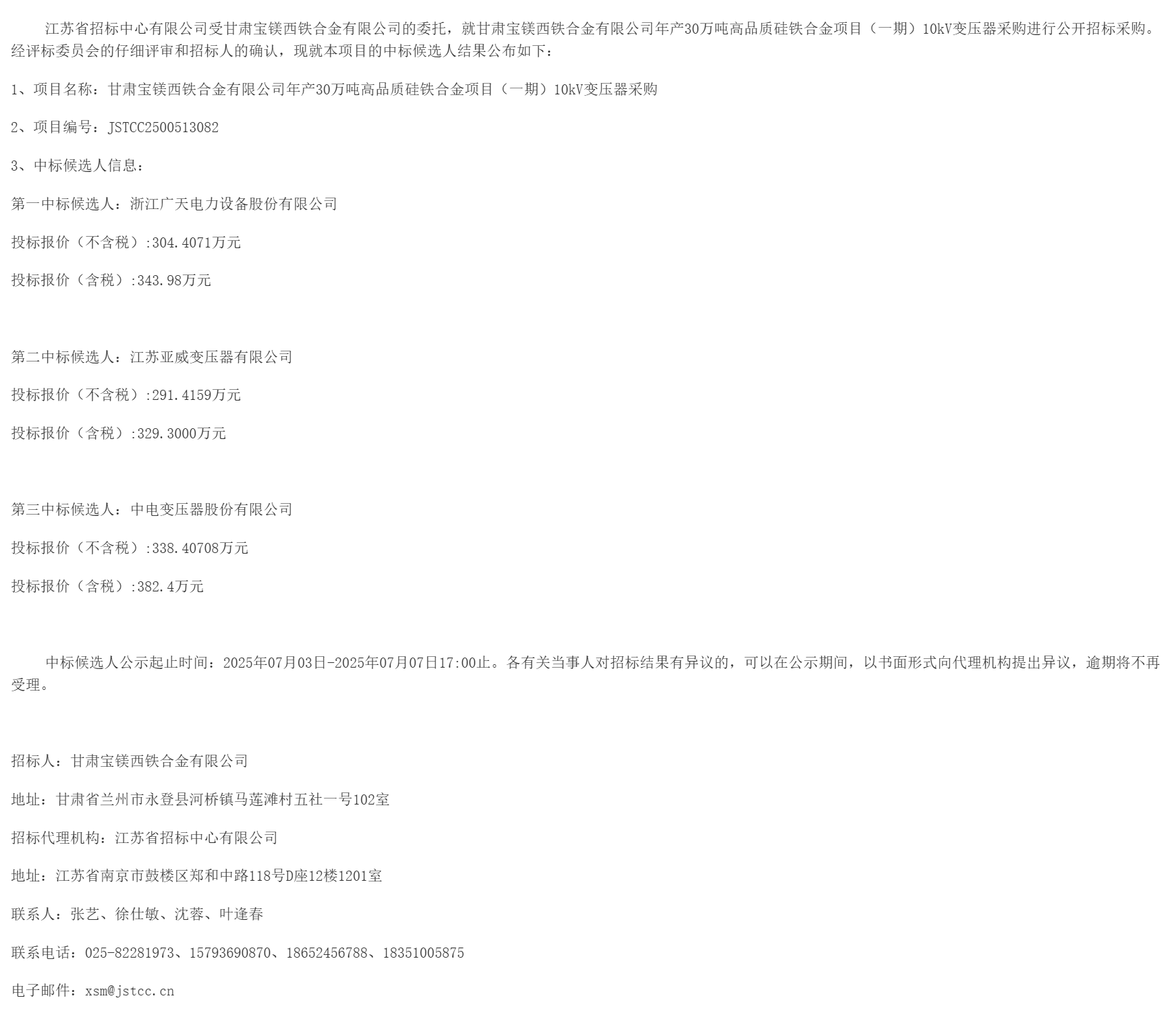 江苏省招标中心有限公司受甘肃宝镁西铁合金有限公司的委托,就甘肃宝镁西铁合金有限公司年产**万吨高品质硅铁合金项目(一期)****变压器采购进行公开招标采购。经评标委员会的仔细评审和招标人的确认,现就本项目的中标候选人结果公布如下:
