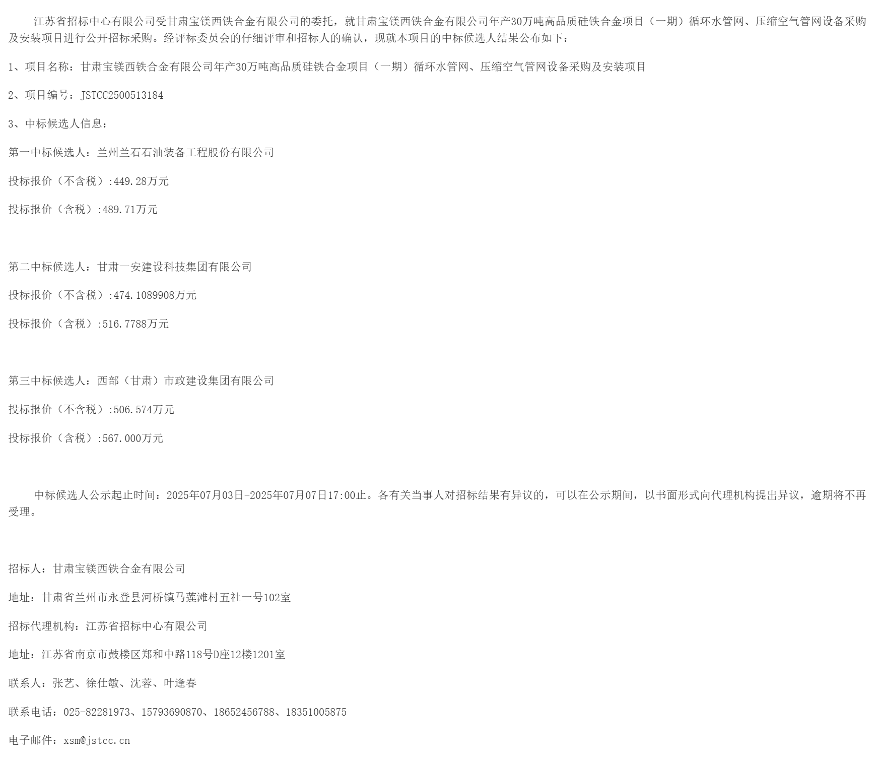 甘肃宝镁西铁合金有限公司年产30万吨高品质硅铁合金项目(一期)循环水管网、压缩空气管网设备采购及安装项目-中标候选人公示