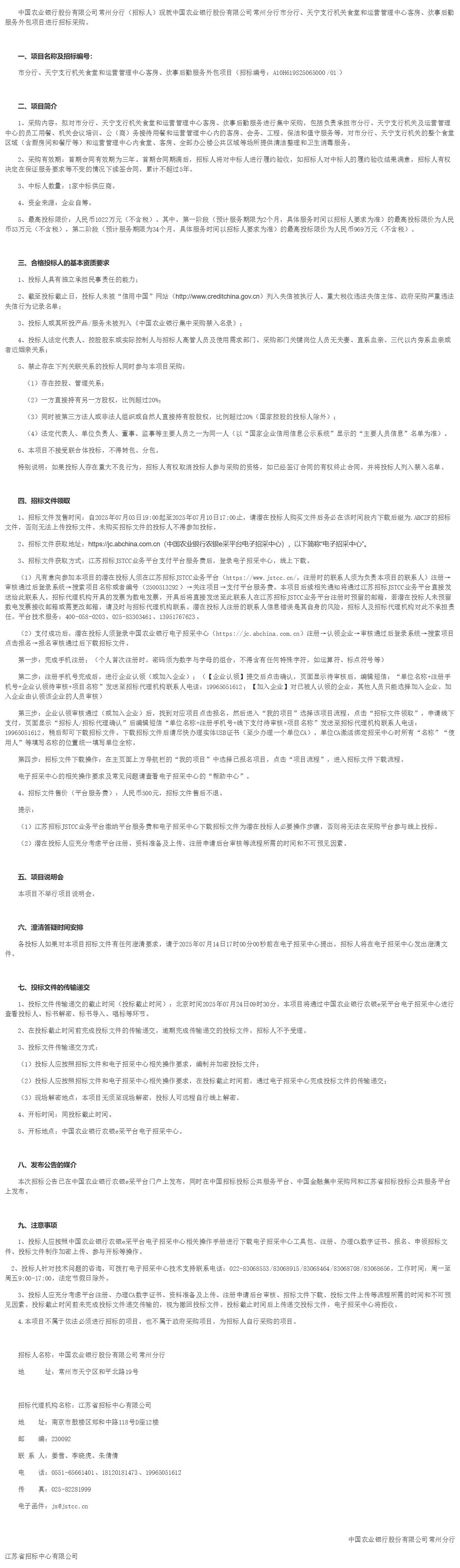 中国农业银行股份有限公司常州分行(招标人)现就中国农业银行股份有限公司常州分行市分行、天宁支行机关食堂和运营管理中心客房、炊事后勤服务外包项目进行招标采购。
