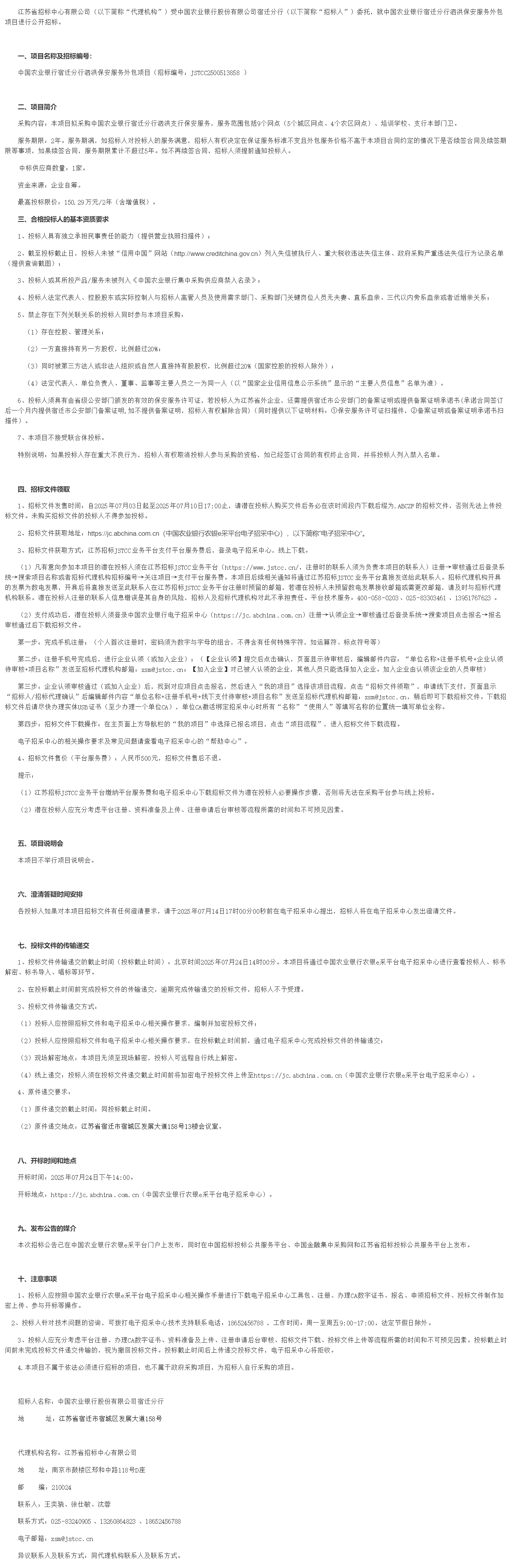 江苏省招标中心有限公司(以下简称“代理机构”)受中国农业银行股份有限公司宿迁分行(以下简称“招标人”)委托,就中国农业银行宿迁分行泗洪保安服务外包项目进行公开招标。