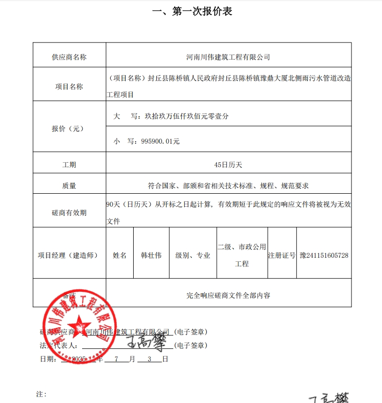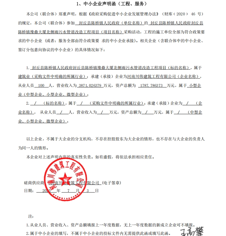 封丘县陈桥镇人民政府封丘县陈桥镇豫鼎大厦北侧雨污水管道改造工程项目*结果公告