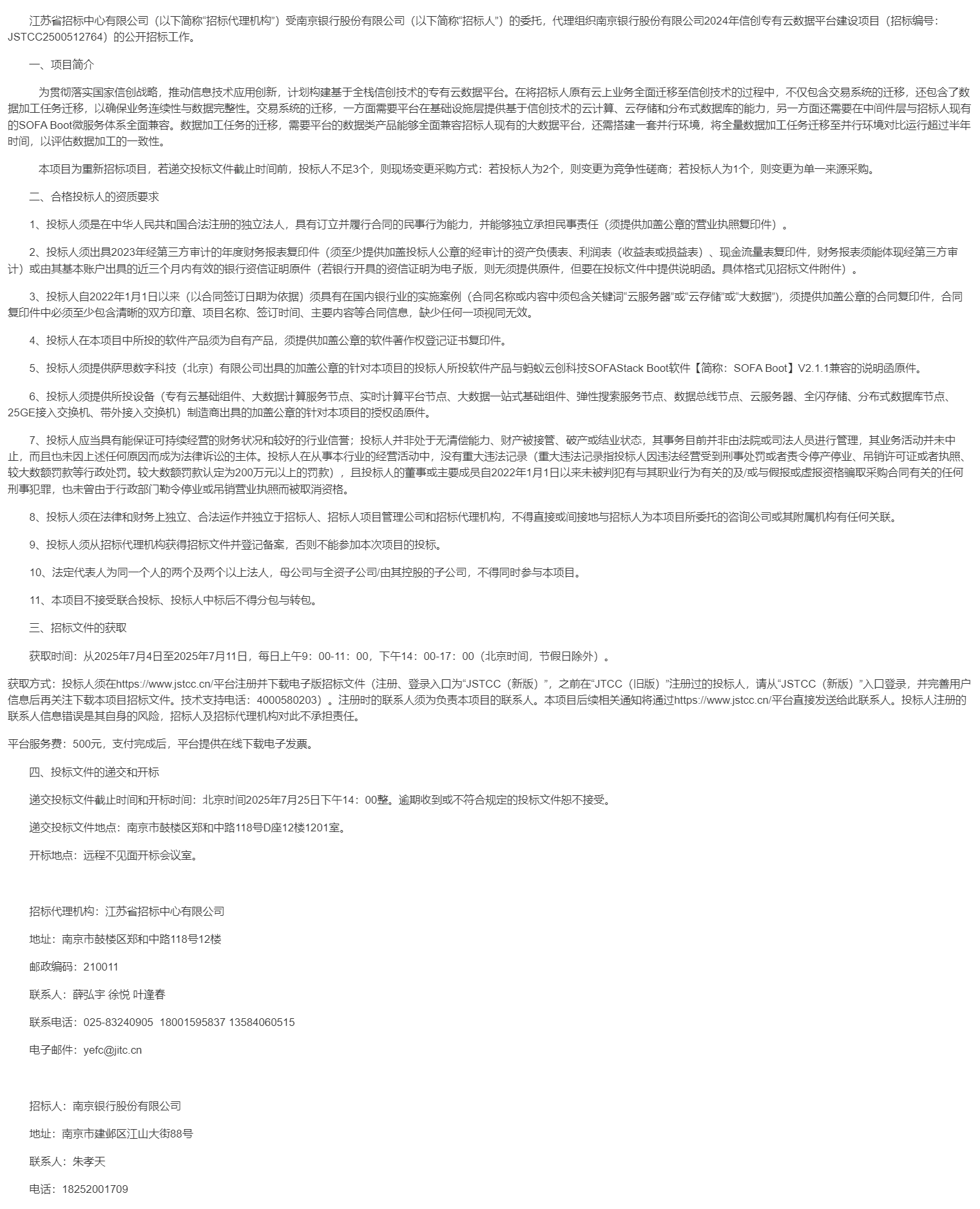 江苏省招标中心有限公司(以下简称“招标代理机构”)受南京银行股份有限公司(以下简称“招标人”)的委托,代理组织南京银行股份有限公司****年信创专有云数据平台建设项目(招标编号:***************)的公开招标工作。