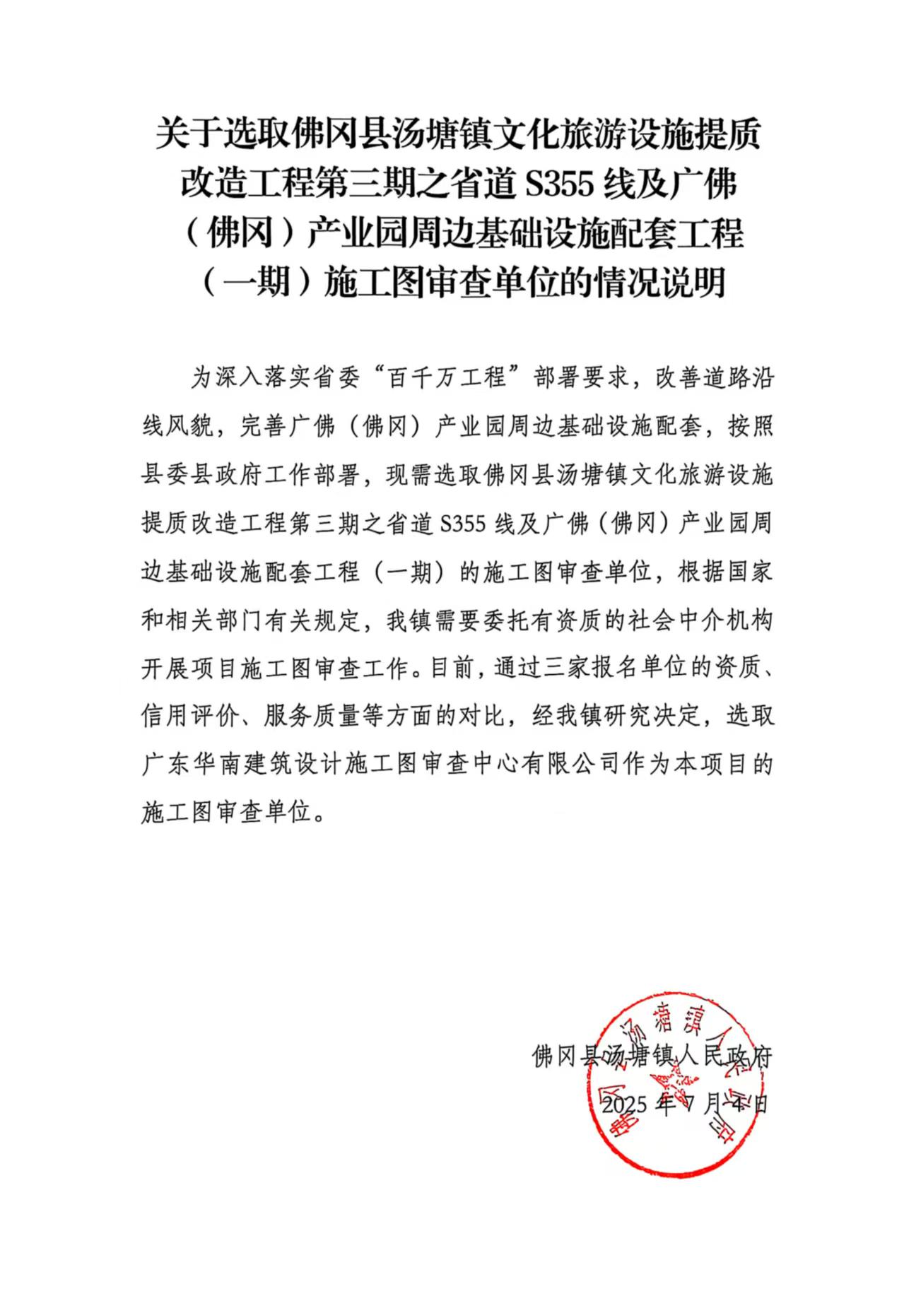 佛冈县汤塘镇文化旅游设施提质改造工程第三期之省道S355线及广佛(佛冈)产业园周边基础设施配套工程(一期)中选公示