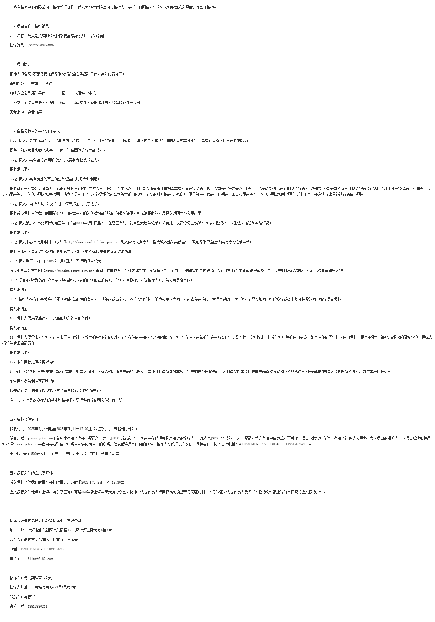 江苏省招标中心有限公司(招标代理机构)受光大期货有限公司(招标人)委托,就网络安全态势感知平台采购项目进行公开招标。