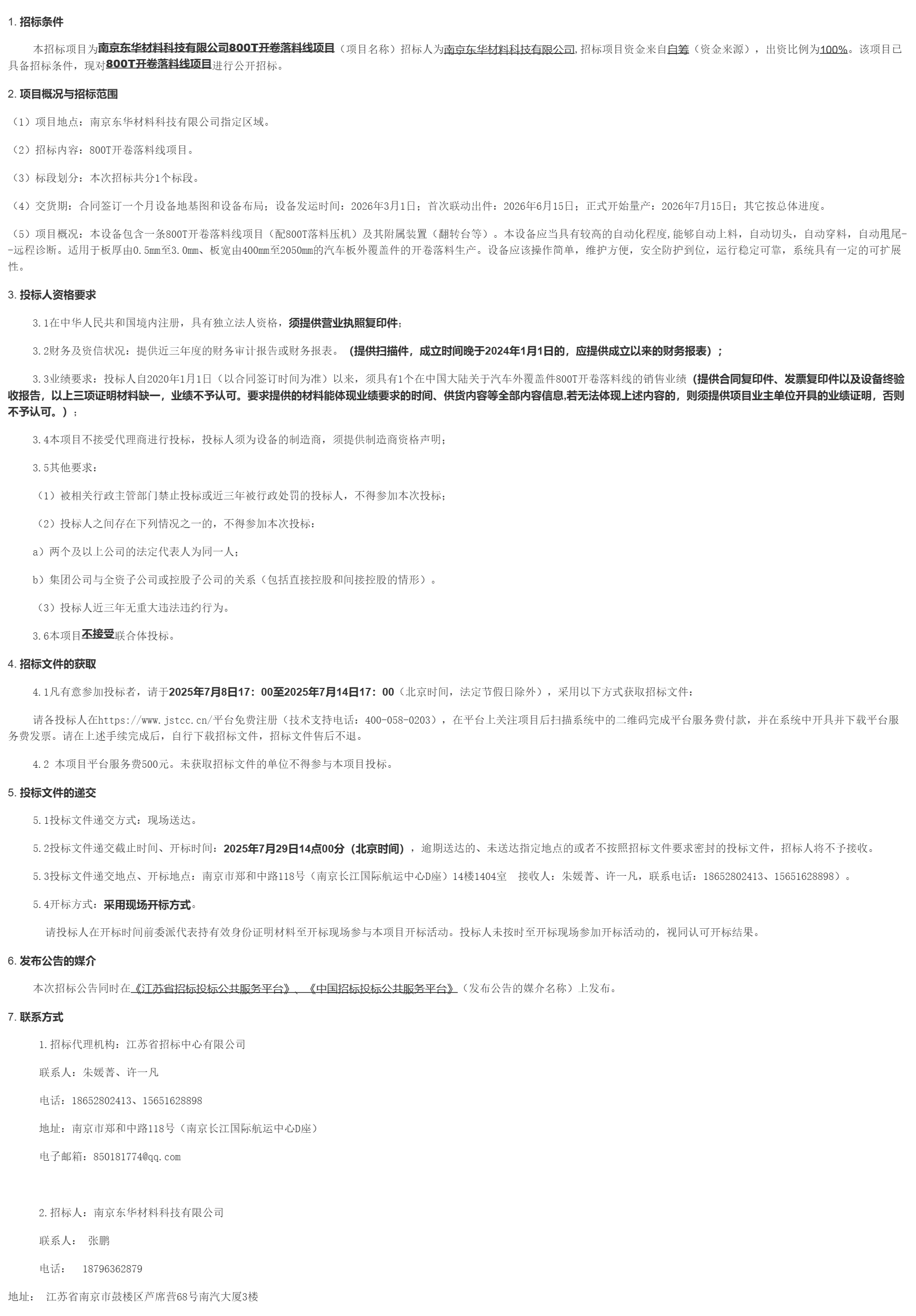 南京东华材料科技有限公司****开卷落料线项目招标公告