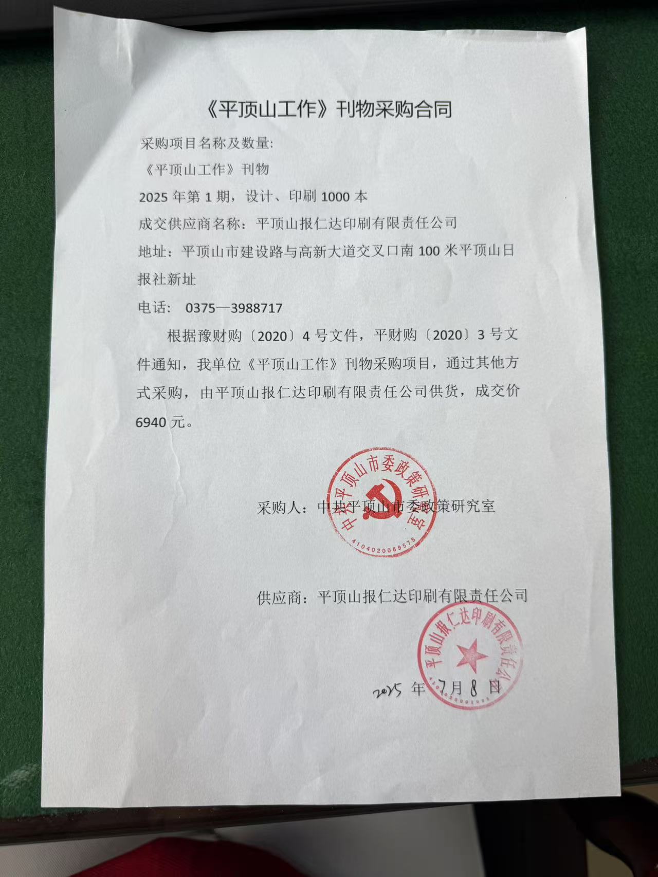 | *.供应商(乙方):平顶山报仁达印刷有限责任公司 | ||||||||||||