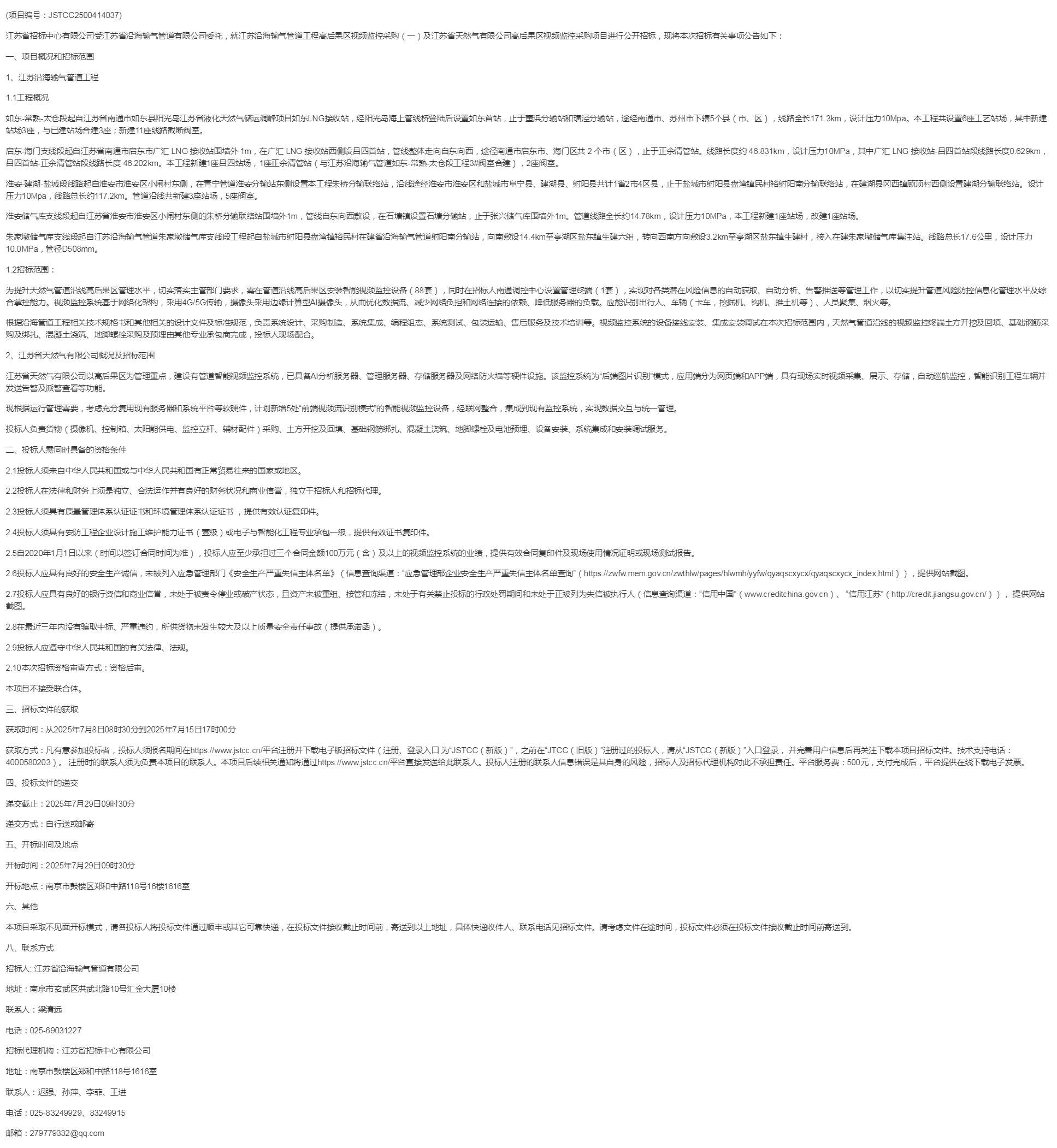 江苏沿海输气管道工程高后果区视频监控采购(一)及江苏省天然气有限公司高后果区视频监控采购项目招标公告