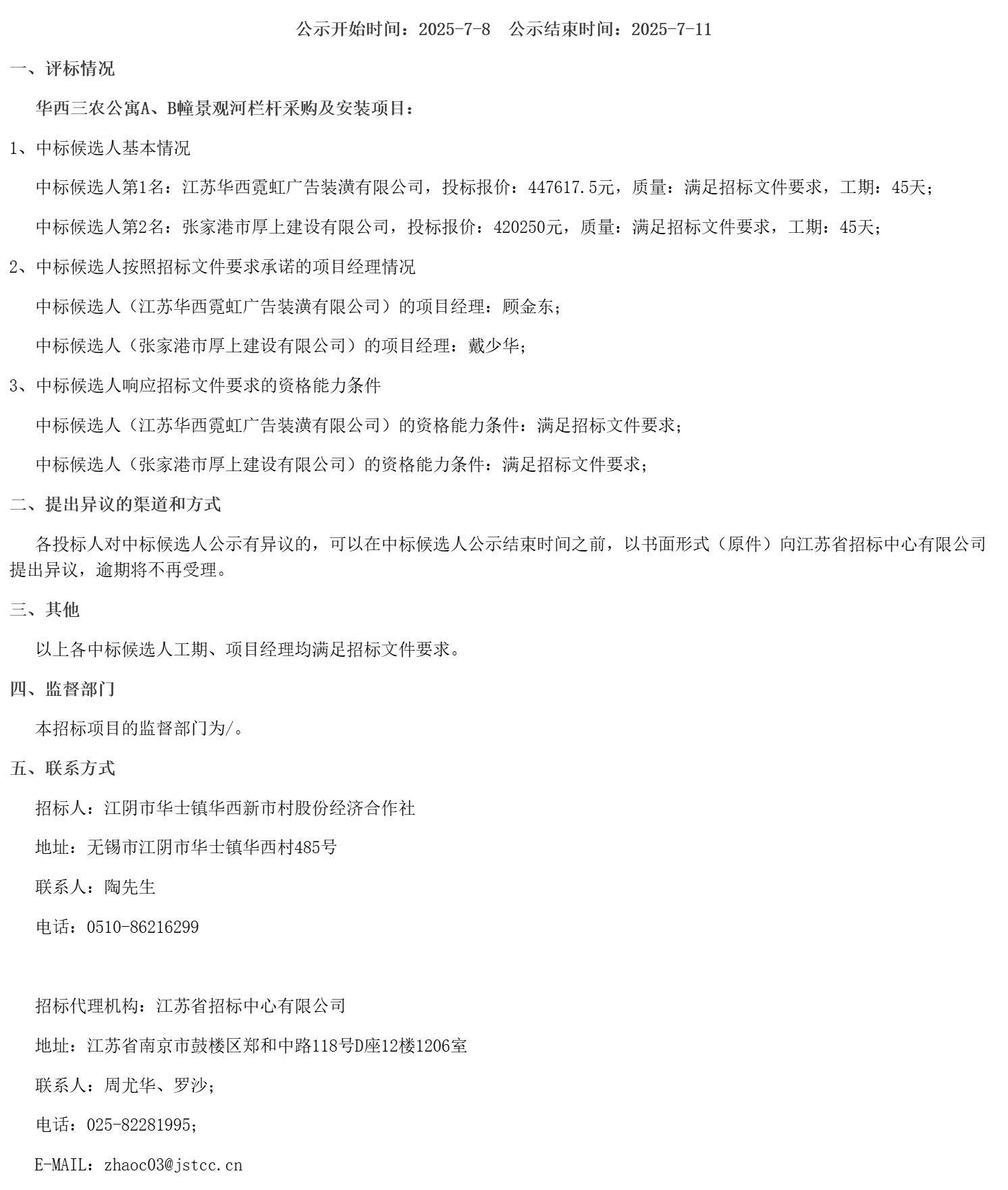 江阴市华士镇华西新市村股份经济合作社华西三农公寓A、B幢景观河栏杆采购及安装项目中标候选人公示(JSTCC2500311224)