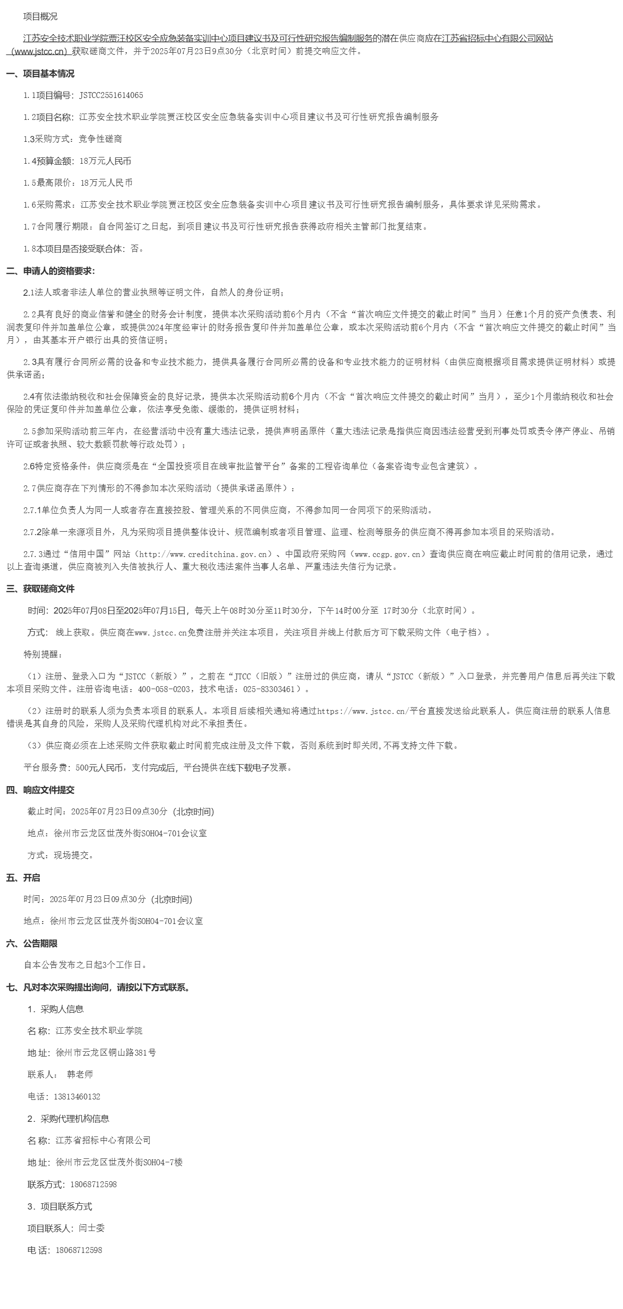 江苏安全技术职业学院贾汪校区安全应急装备实训中心项目建议书及可行性研究报告编制服务的潜在供应商应在江苏省招标中心有限公司网站(***.*****.**)获取磋商文件,并于****年**月**日*点**分(北京时间)前提交响应文件。