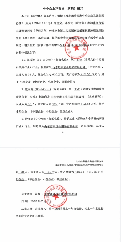 项目用途:用于北京市第二儿童福利院纸尿裤及护理垫采购项目。