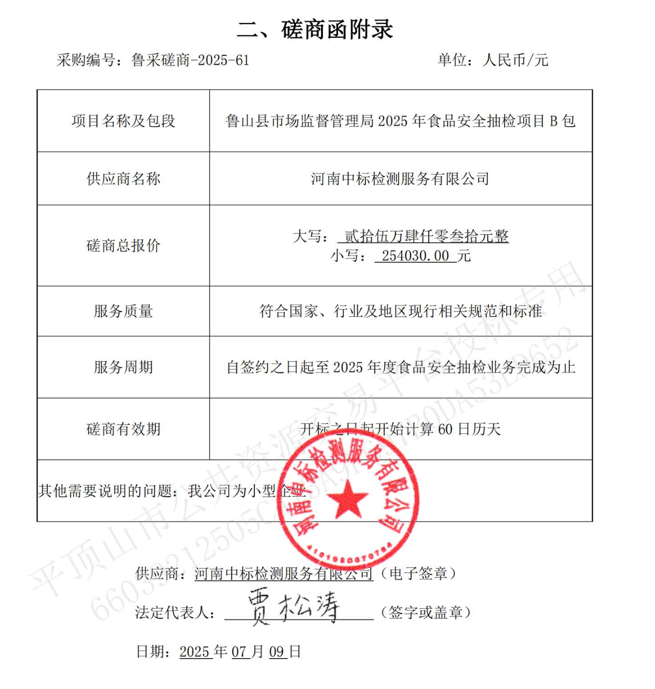 【平公资采2025501号】鲁山县市场监督管理局2025年食品安全抽检项目B包-成交公告