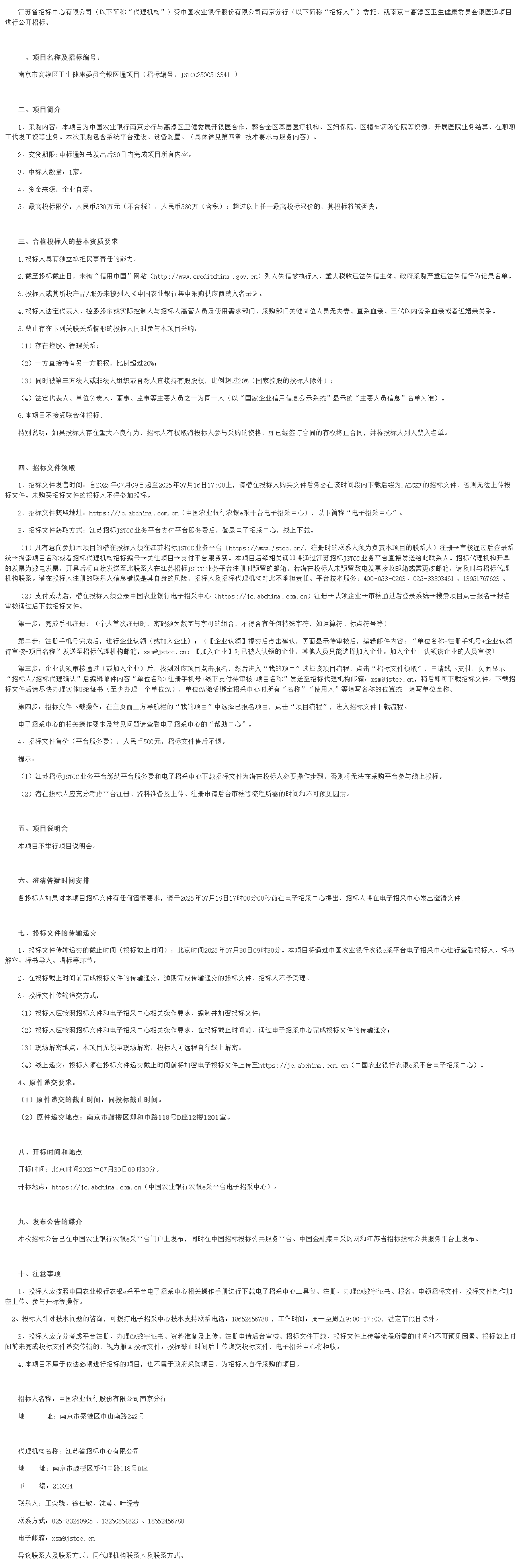 江苏省招标中心有限公司(以下简称“代理机构”)受中国农业银行股份有限公司南京分行(以下简称“招标人”)委托,就南京市高淳区卫生健康委员会银医通项目进行公开招标。