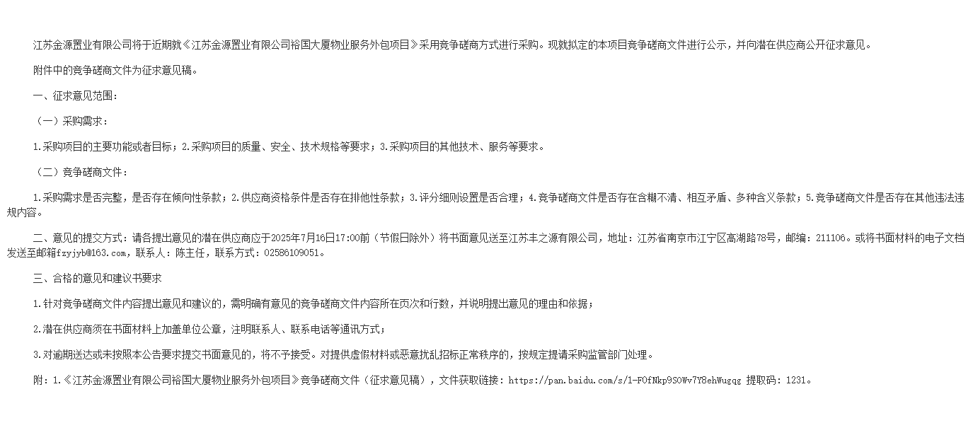 江苏金源置业有限公司将于近期就《江苏金源置业有限公司裕国大厦物业服务外包项目》采用竞争磋商方式进行采购。现就拟定的本项目竞争磋商文件进行公示,并向潜在供应商公开征求意见。