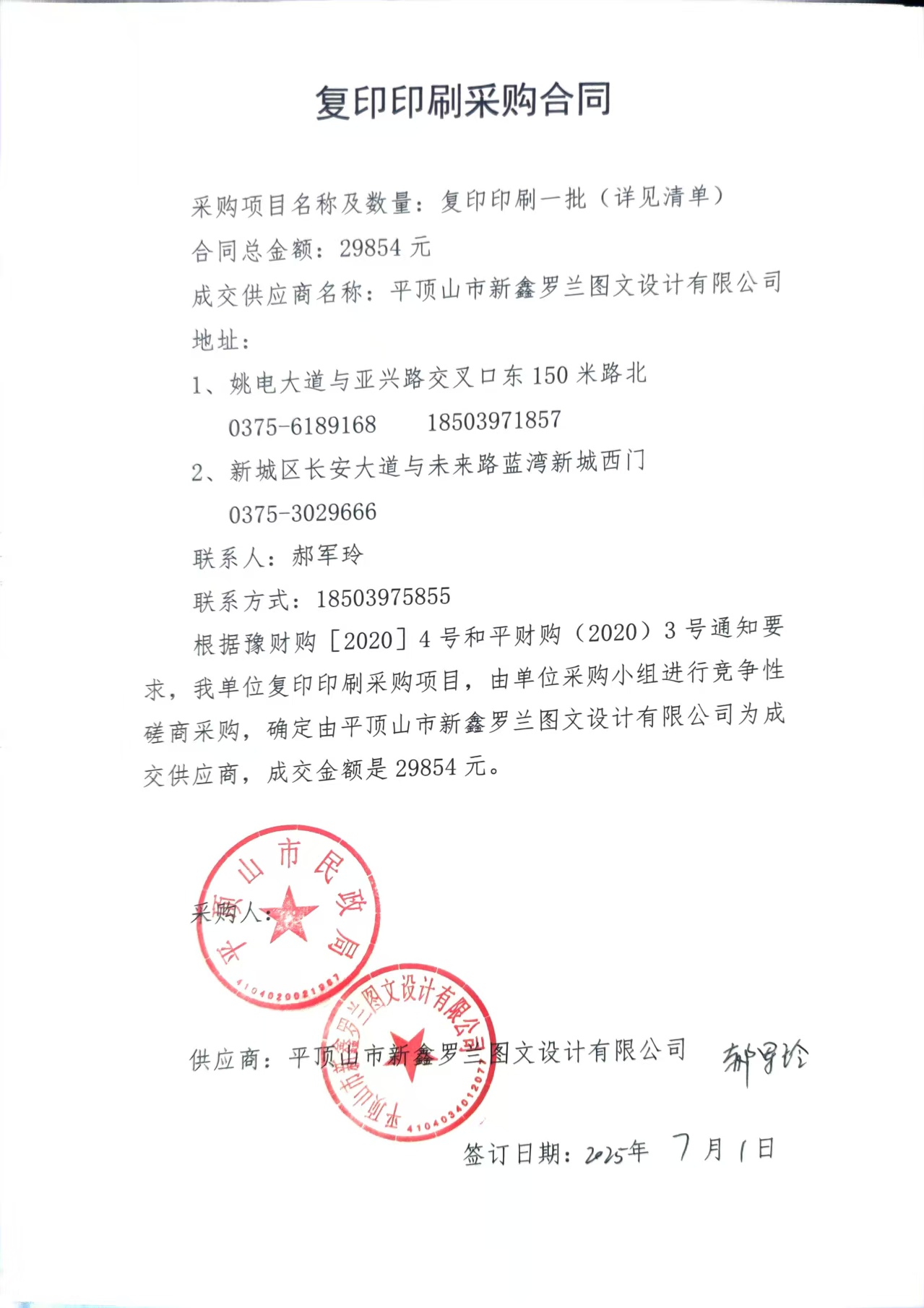 | 二、合同名称:平顶山市民政局公务印刷 | ||||||||||||